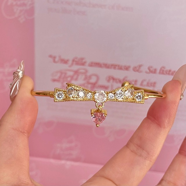 まるでリボンに恋をしたみたいに、手元にきゅんとした甘さをプラス。 動くたびにキラキラと輝くジルコニアが、上品な存在感を放ちます。 華奢なデザインなので、単品でも重ね付けでも大活躍。 お姫様気分を纏いたい日にぴったりのアイテムです 【素材】 ・サージカルステンレス+18K金コーティング ・ジルコニア使用 【サイズ】 ・フリーサイズ(調整可能) 【ご注意】 より長く美しい状態を保つため、強い衝撃や摩擦はお避けください。 保管時は柔らかい布で軽く拭き、個別に収納するのがおすすめです。