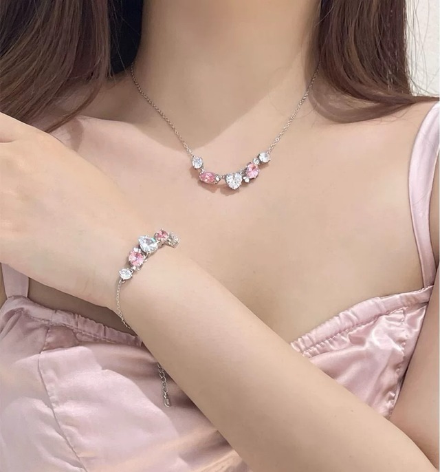 まるでキャンディのようにカラフルなジルコニアがきらめく、夏にぴったりのアクセサリーセット。 甘くて華やかなデザインが、手元とデコルテにときめきを添えてくれます。 ブレスレットとネックレス、どちらも軽やかなチェーンで仕上げており、 シンプルなコーデのアクセントにも、特別なギフトにもおすすめです。 【素材】サージカルステンレス、ジルコニア 【サイズ】 ネックレス:41cm + 5cm(アジャスター) ブレスレット:15cm + 5cm(アジャスター)