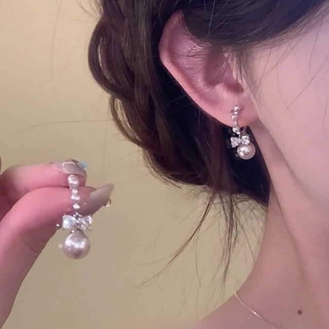 繊細にきらめくリボンモチーフが耳元を華やかに飾る、S925シルバー×5Aジルコニアの上質ピアス。 クリアストーンならではの強い輝きが、角度を変えるたびにふわっと光を放ち、上品で可憐な印象に仕上がります。 【素材】 ・S925シルバー(変色しにくく長く愛用できます) ・高品質5Aジルコニア 【サイズ】 ・3段階の長さ調節が可能(好みのバランスに合わせやすい仕様) 【ポイント】 ・リボン部分は全て5Aジルコニアを使用し、ダイヤのような透明感 ・小ぶりでも存在感のある輝きで、顔まわりを一瞬で華やかに ・S925シルバーで肌に優しく、デイリーにも使いやすい ・カジュアルにもフェミニンにも合わせられる万能デザイン ⋆。°✩ ┈┈┈┈┈┈┈┈ ✩°。⋆ 金属アレルギーについて 当店では、S925/999シルバーやサージカルステンレスなど、アレルギーに配慮した素材を使用しております。さらに、これらの素材には、防アレルギー加工や変色防止加工も施しております。 ただし、お肌の状態には個人差がございますため、ご心配な方は、あらかじめご自身の体質やご体調をご確認のうえ、ご検討いただけますと幸いです。