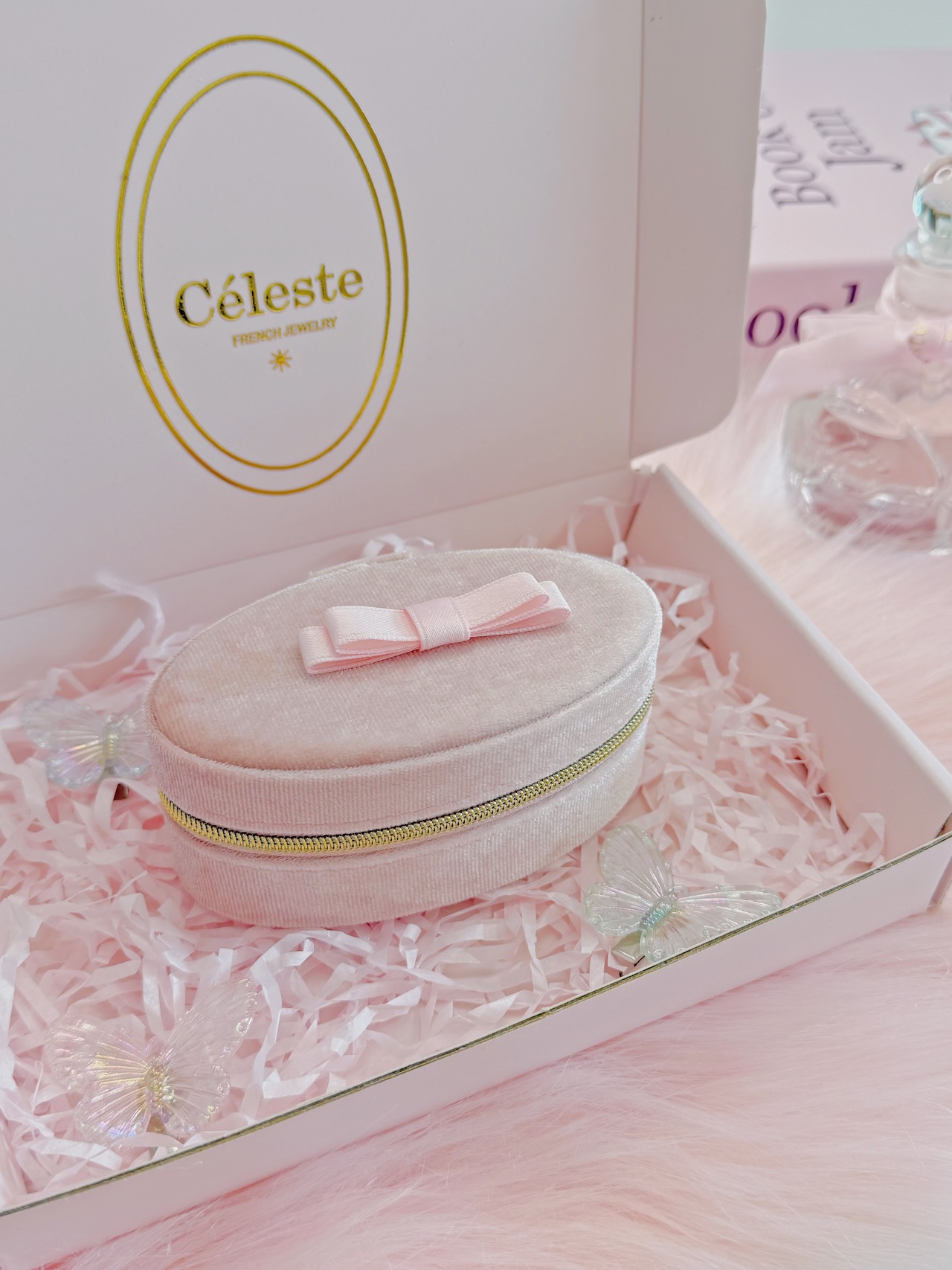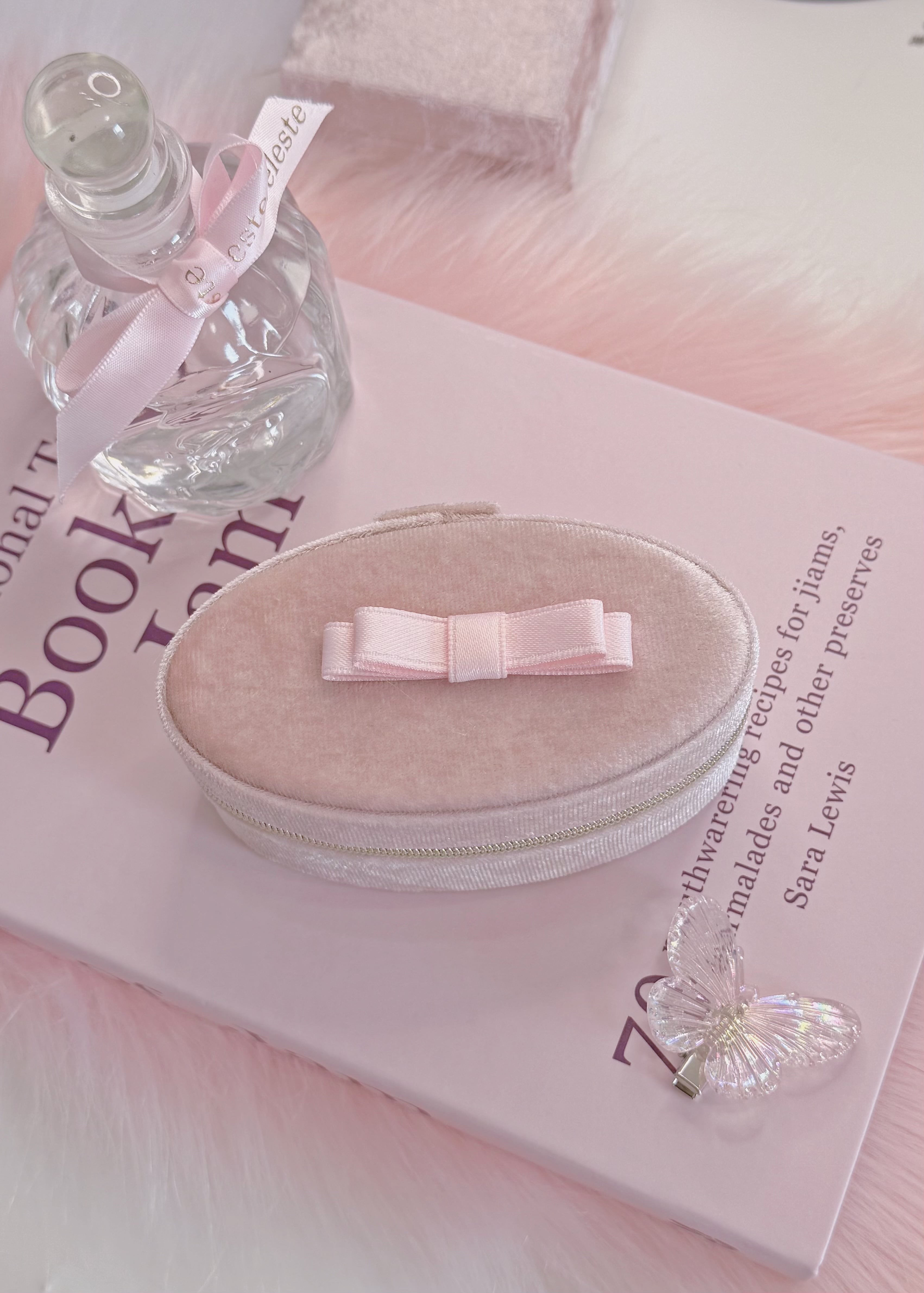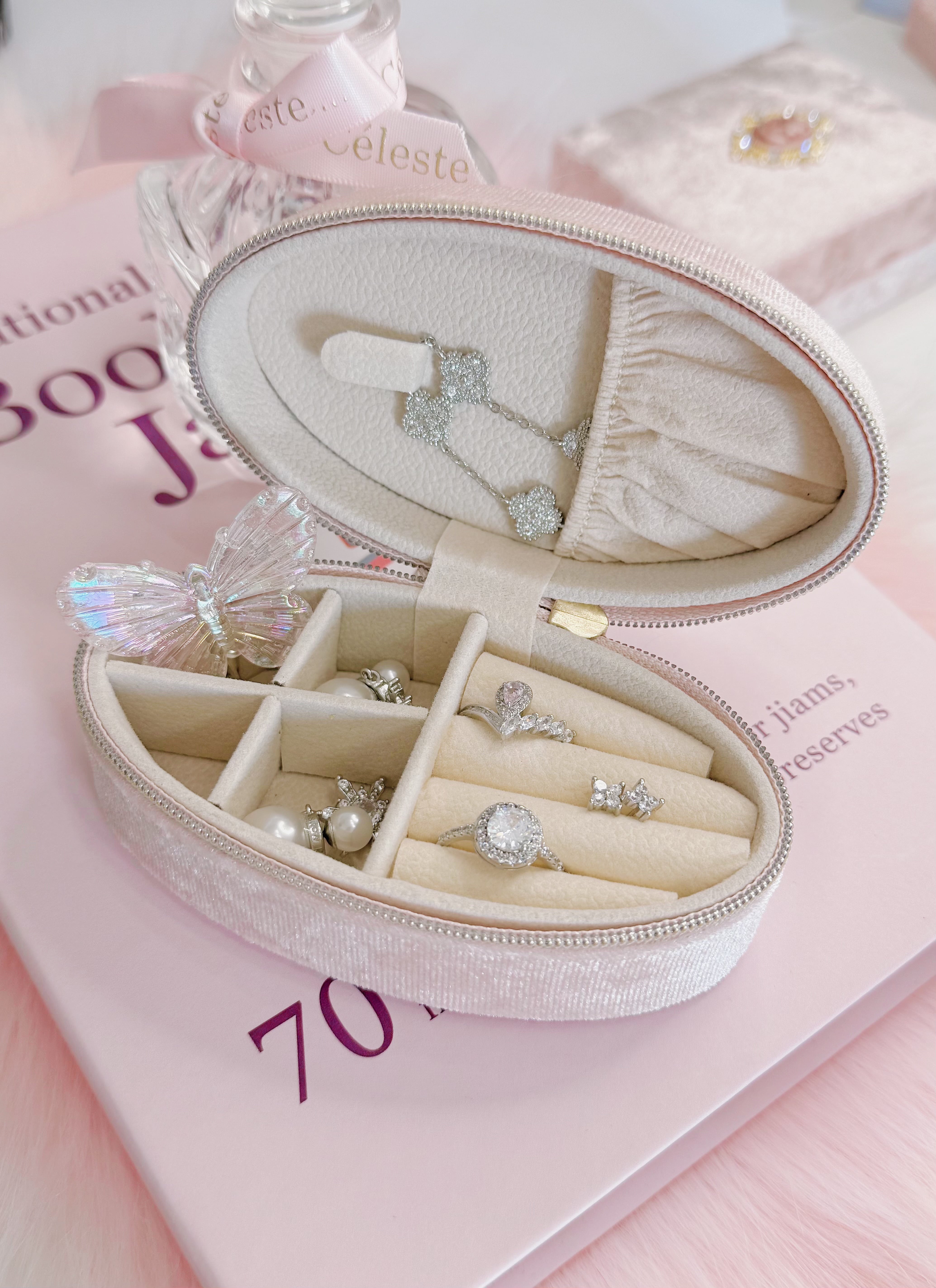 上品なベルベット素材で仕上げた、リボン付きの楕円型ジュエリーボックス。
