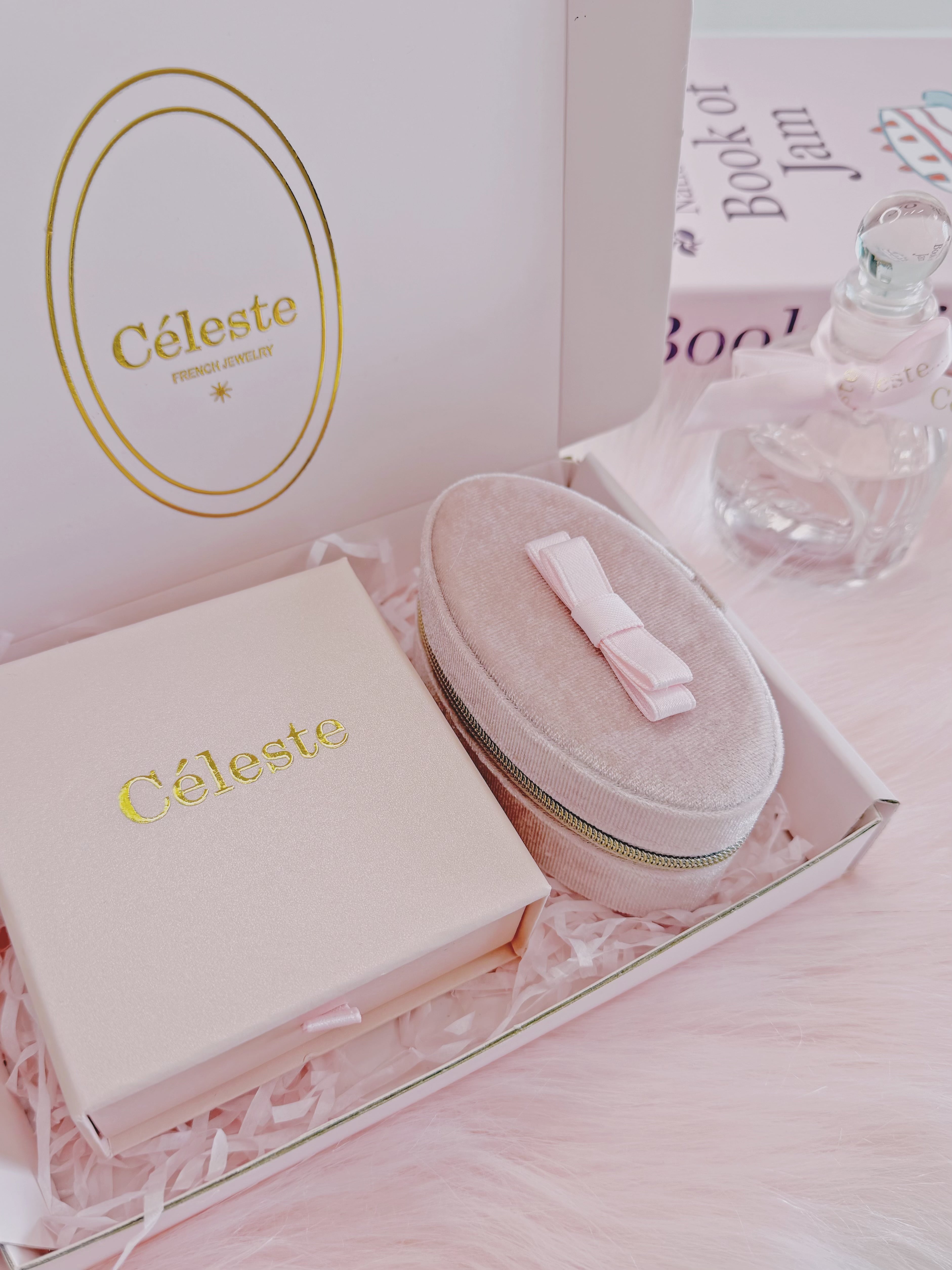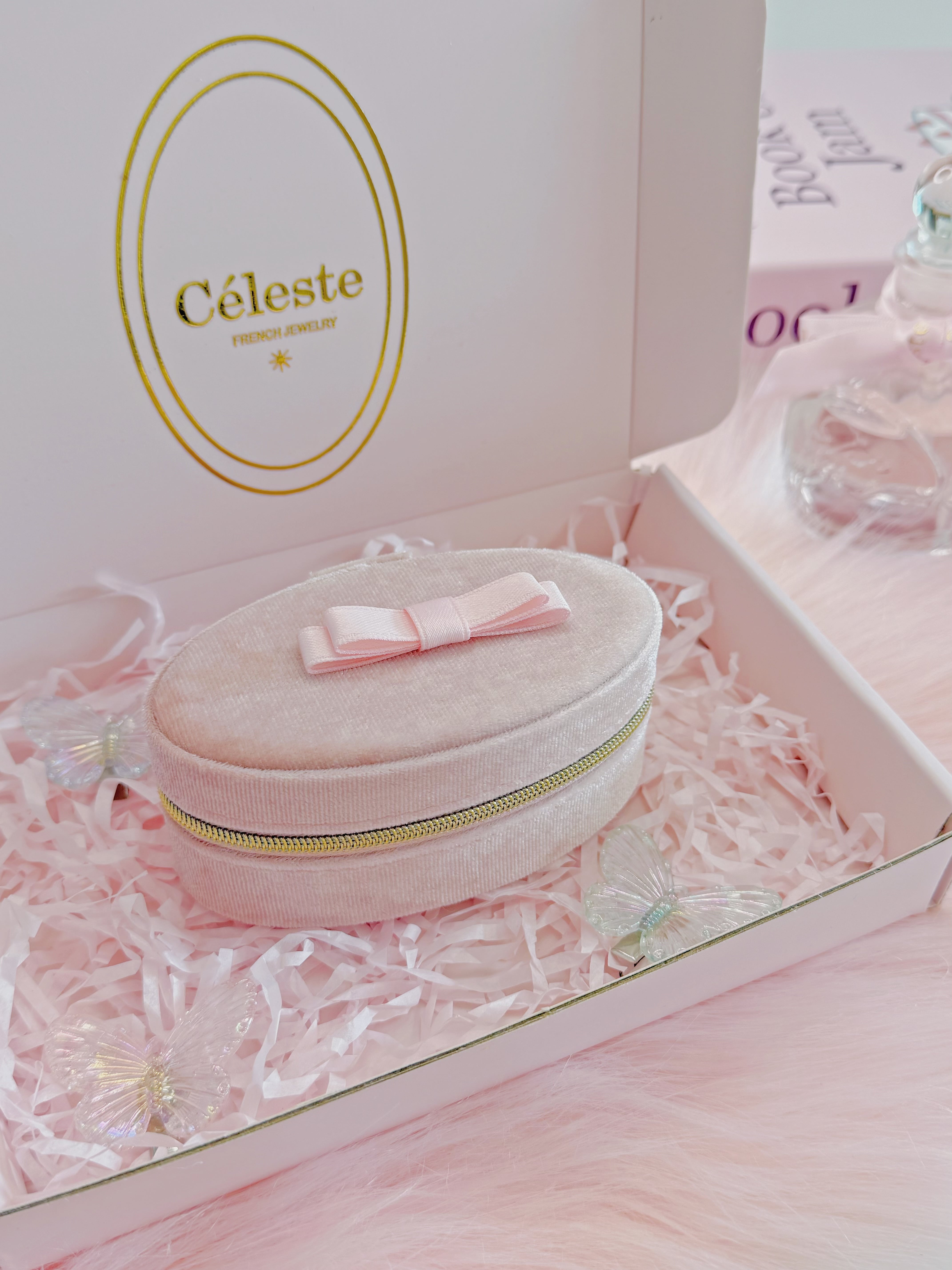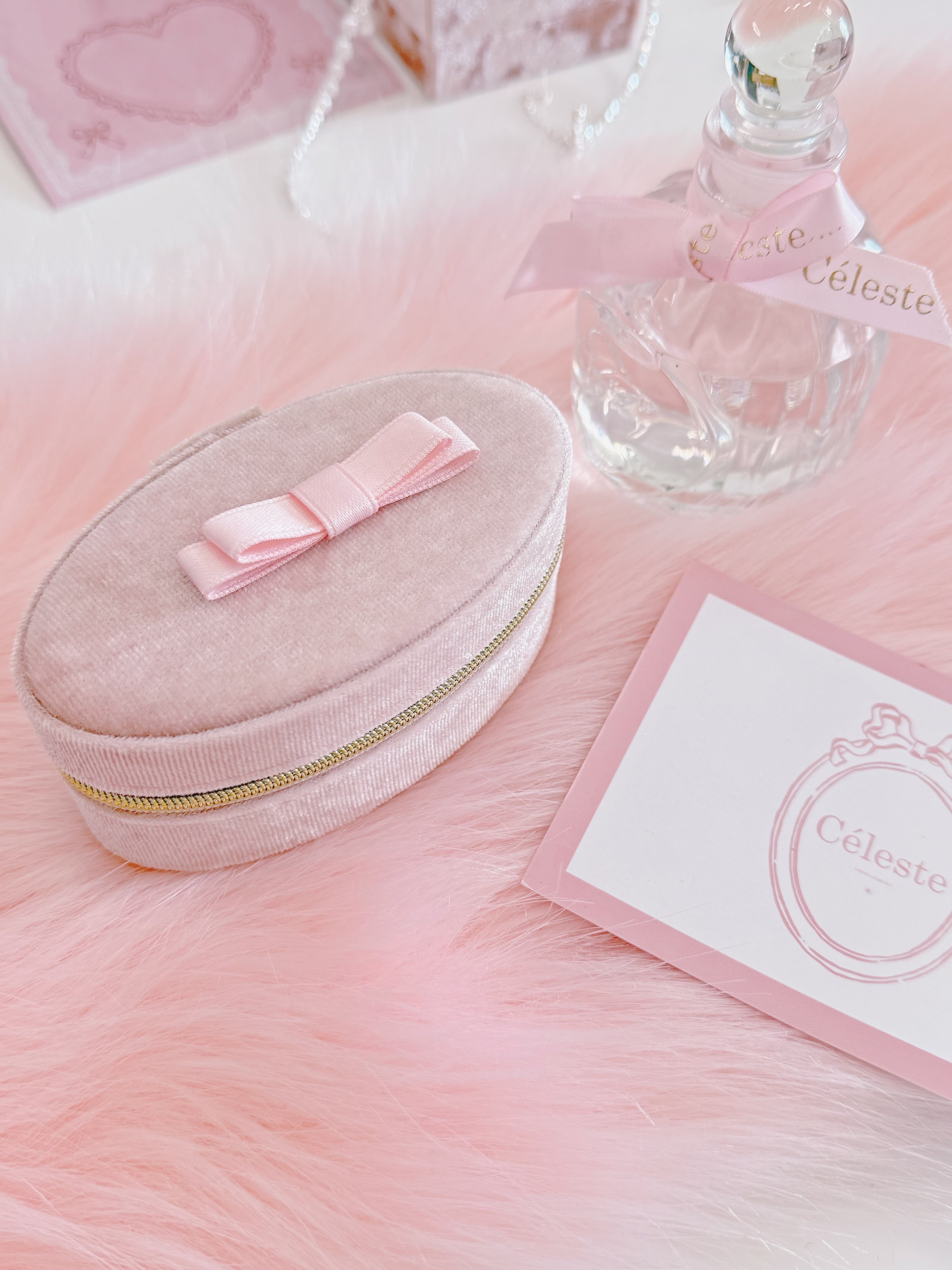 アクセサリーの持ち運びや保管にぴったり。淡いピンクとゴールドのジッパーが大人可愛い印象に。