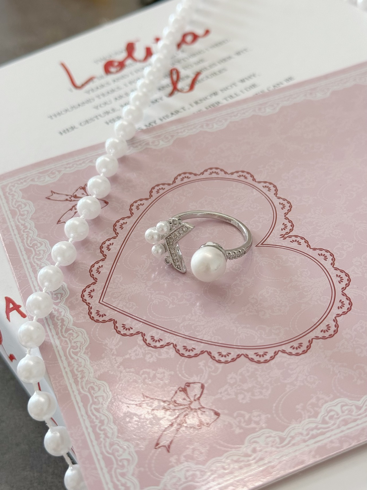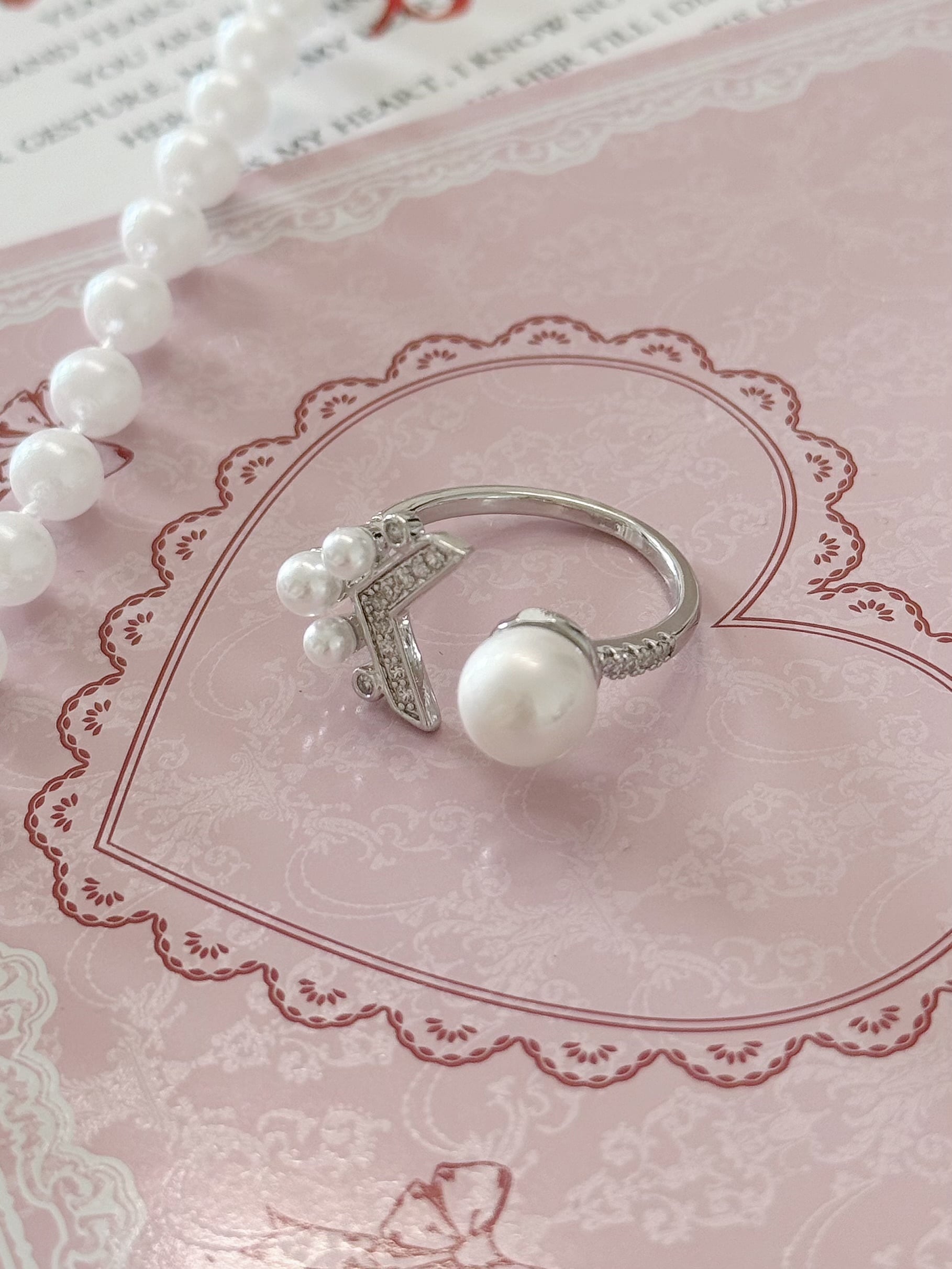 上品なパールと輝くダイヤ風モチーフが目を惹く、エレガントなデザインリング。