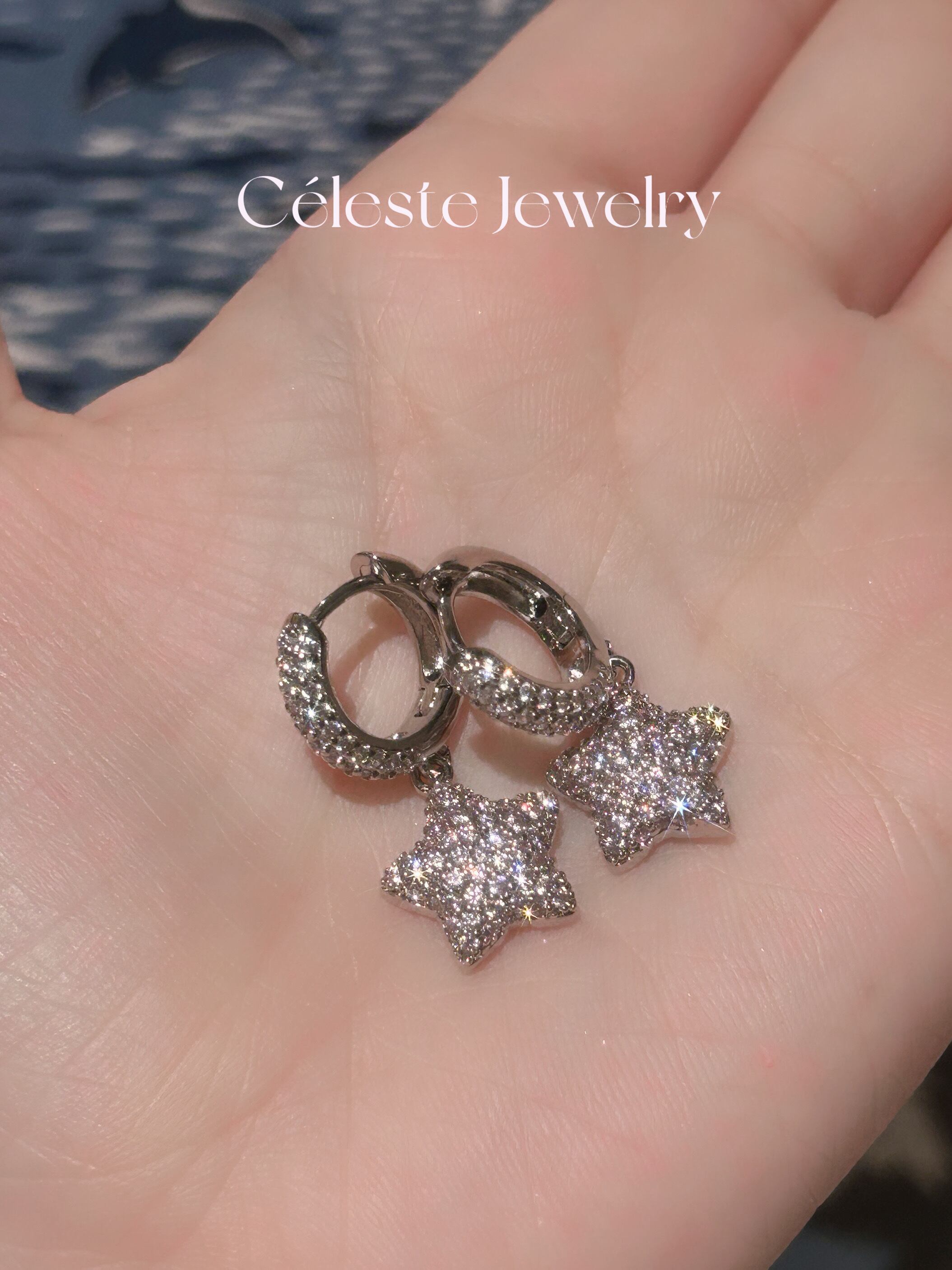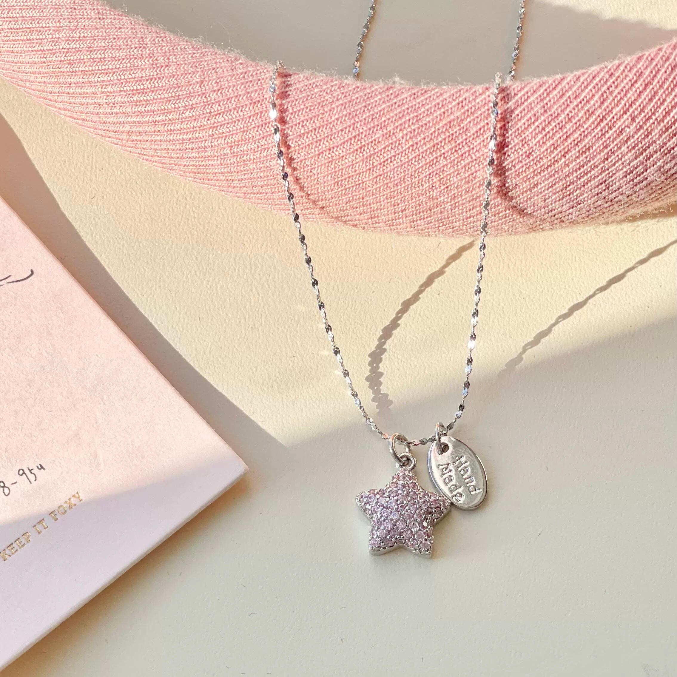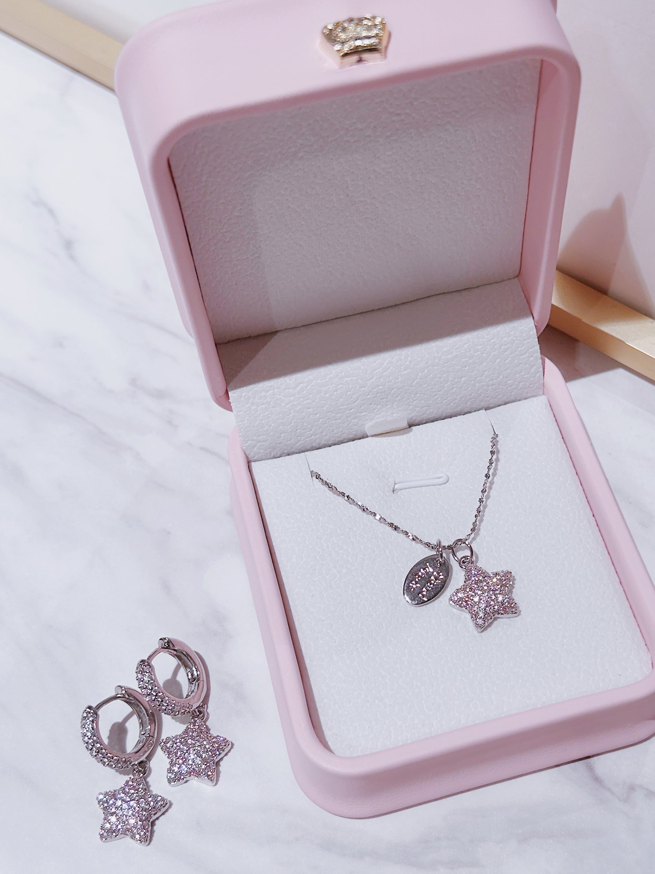 やさしいピンク色のスターモチーフに、繊細なジルコニアの輝きを添えて、まるで夜空に浮かぶ星のような存在感を演出してくれます。