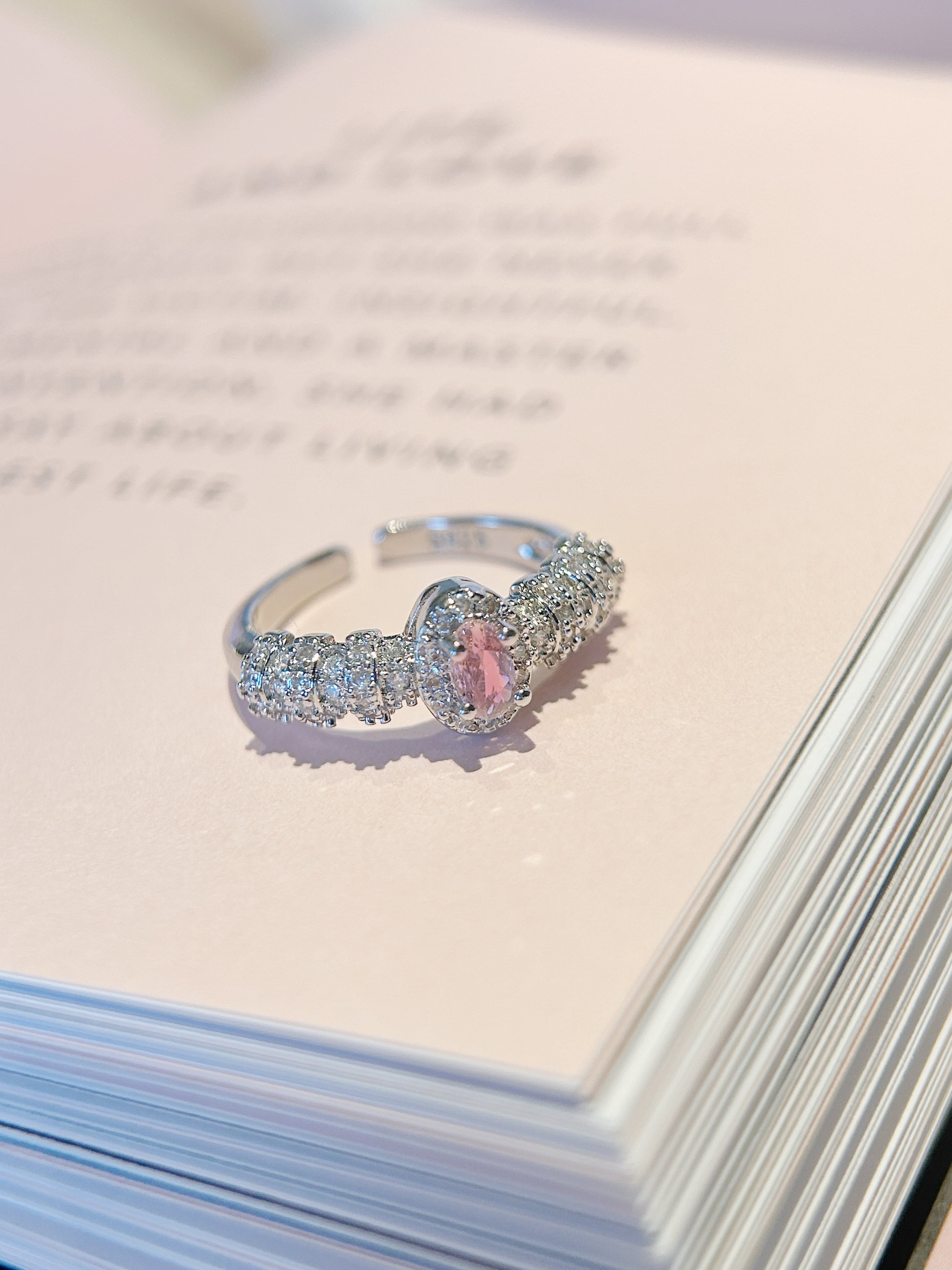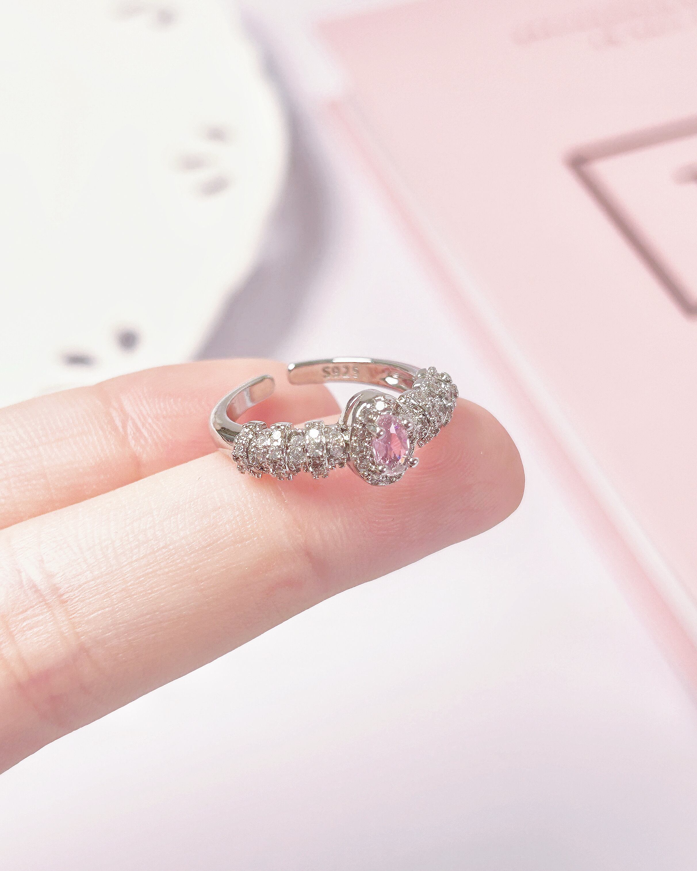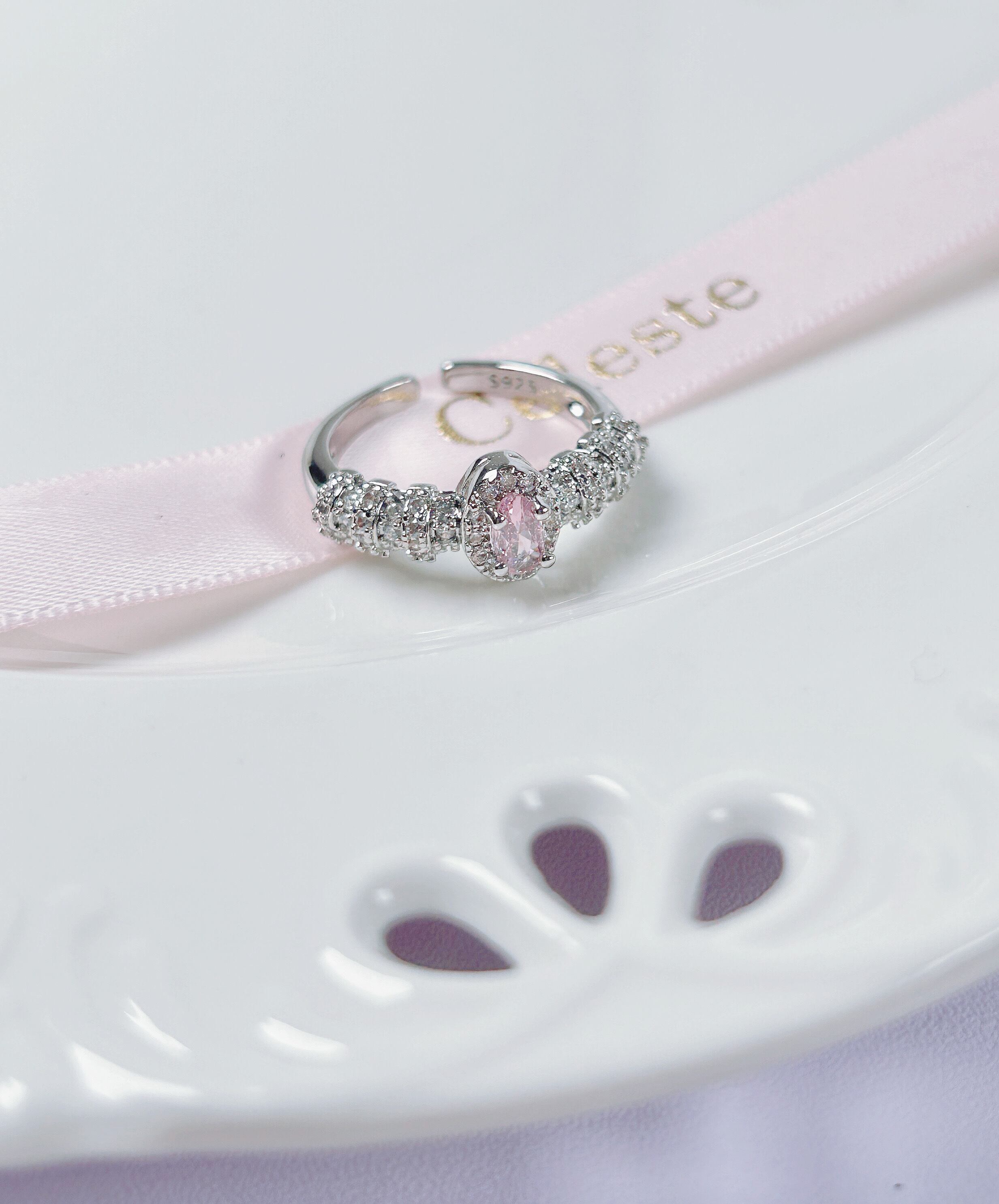 センターには淡いピンクのジルコニアをあしらい、手元にそっと華やかさを添えます。