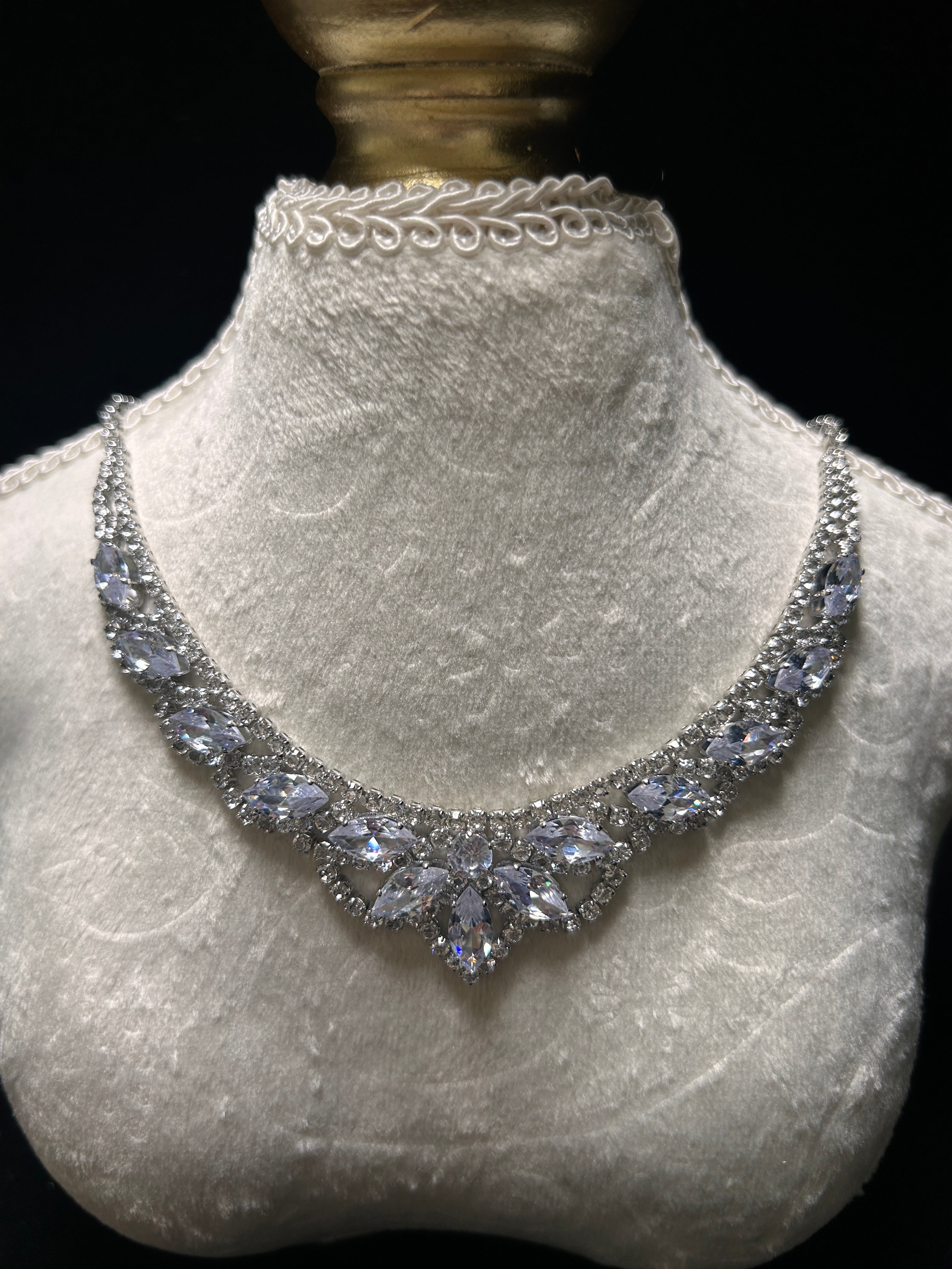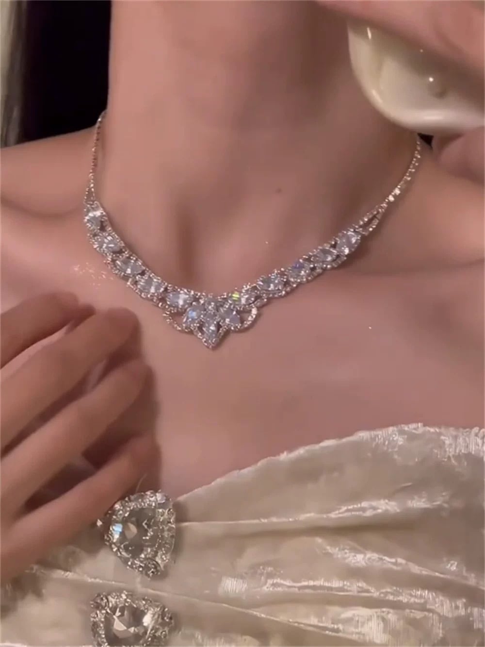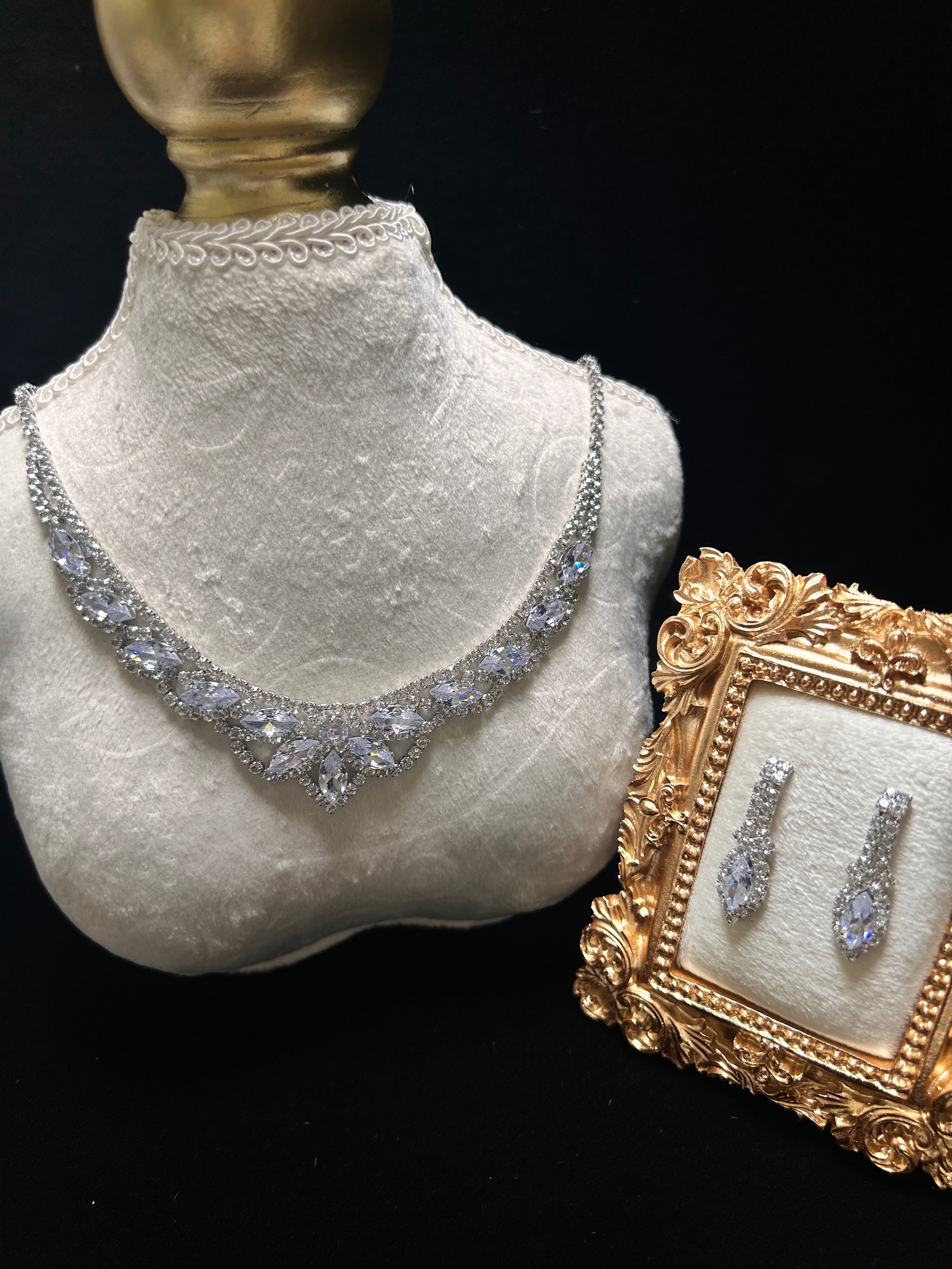 繊細なビジューが首元と耳元を華やかに彩り、特別な日をよりドラマチックに演出します。