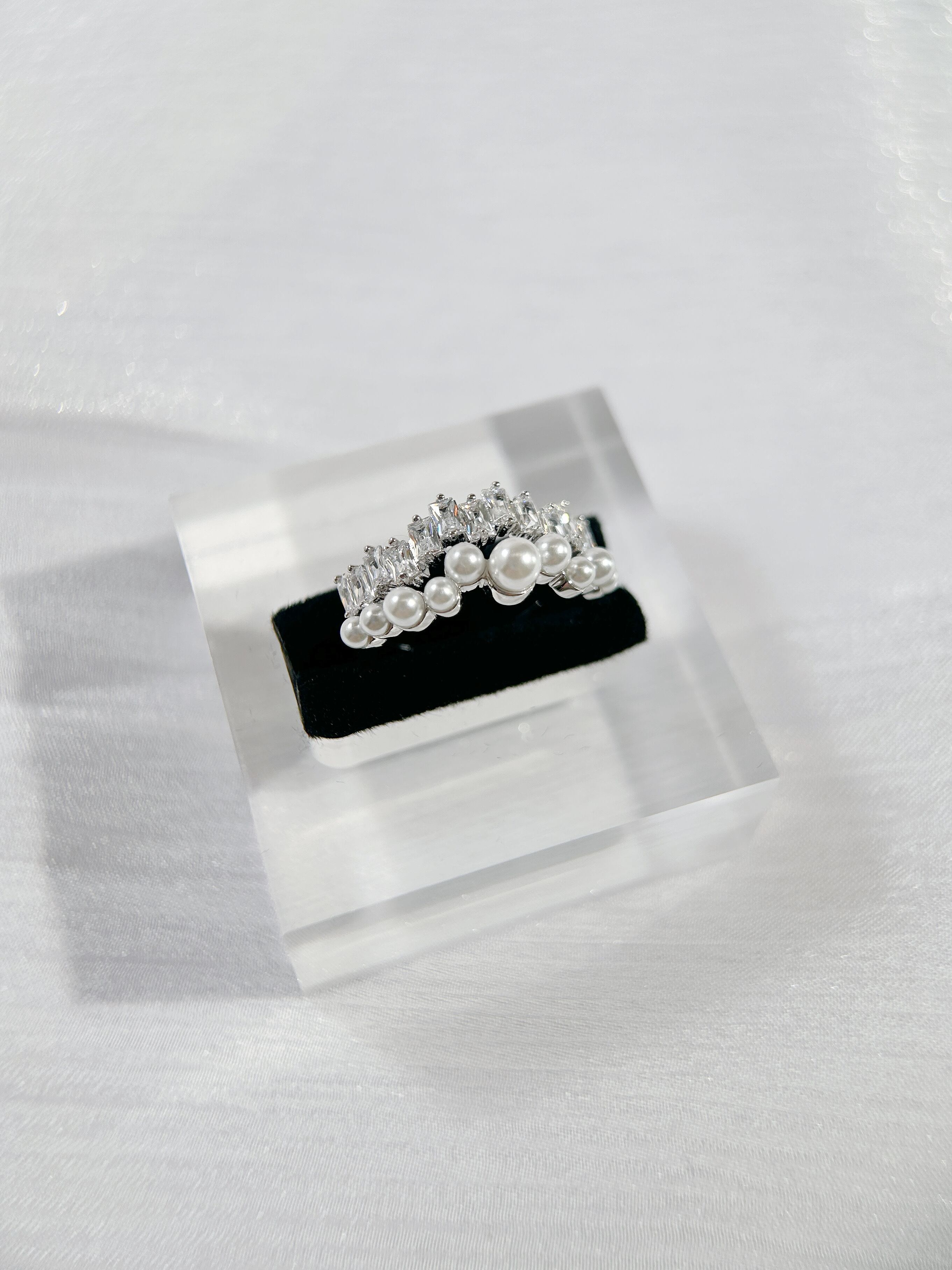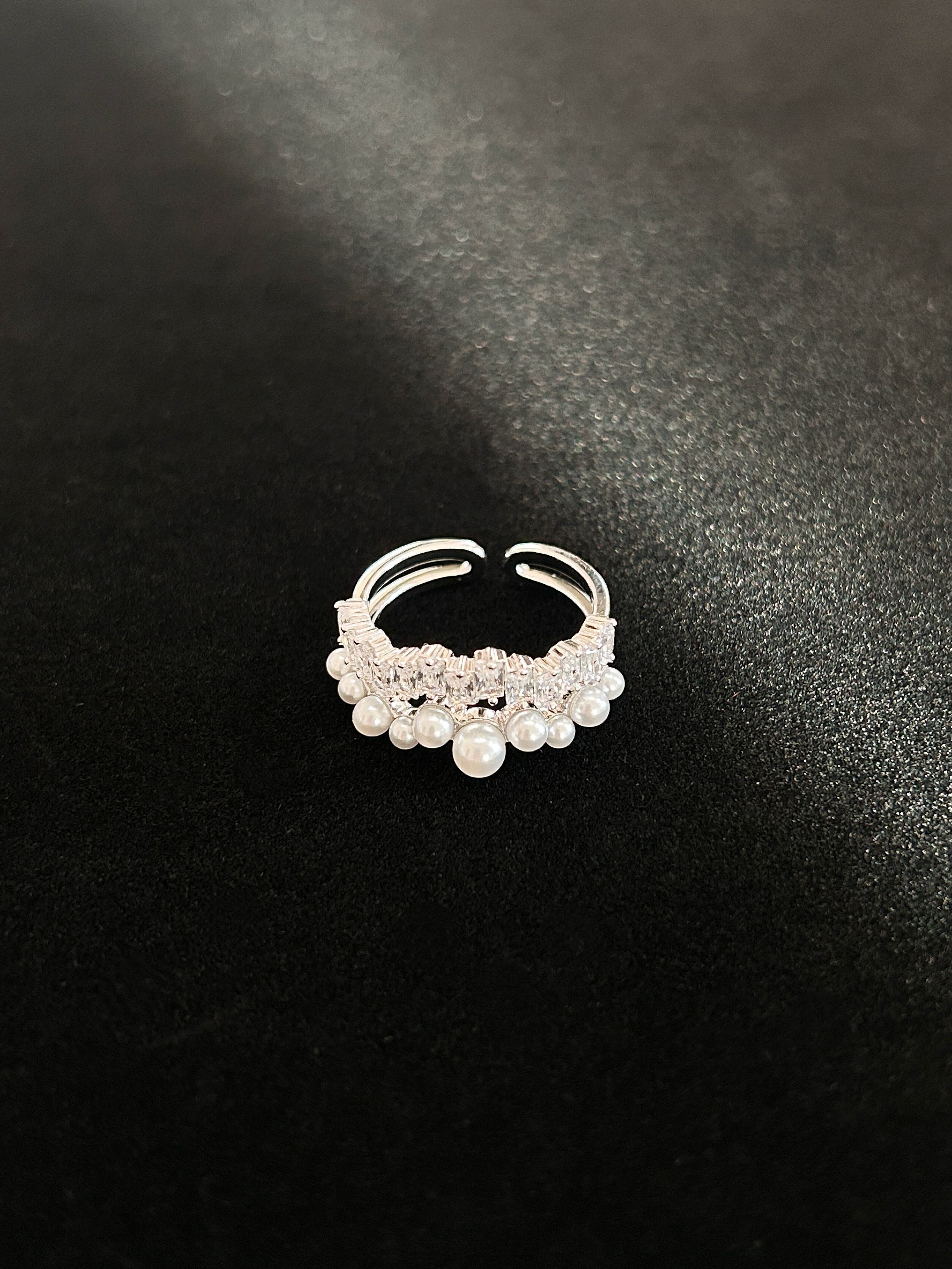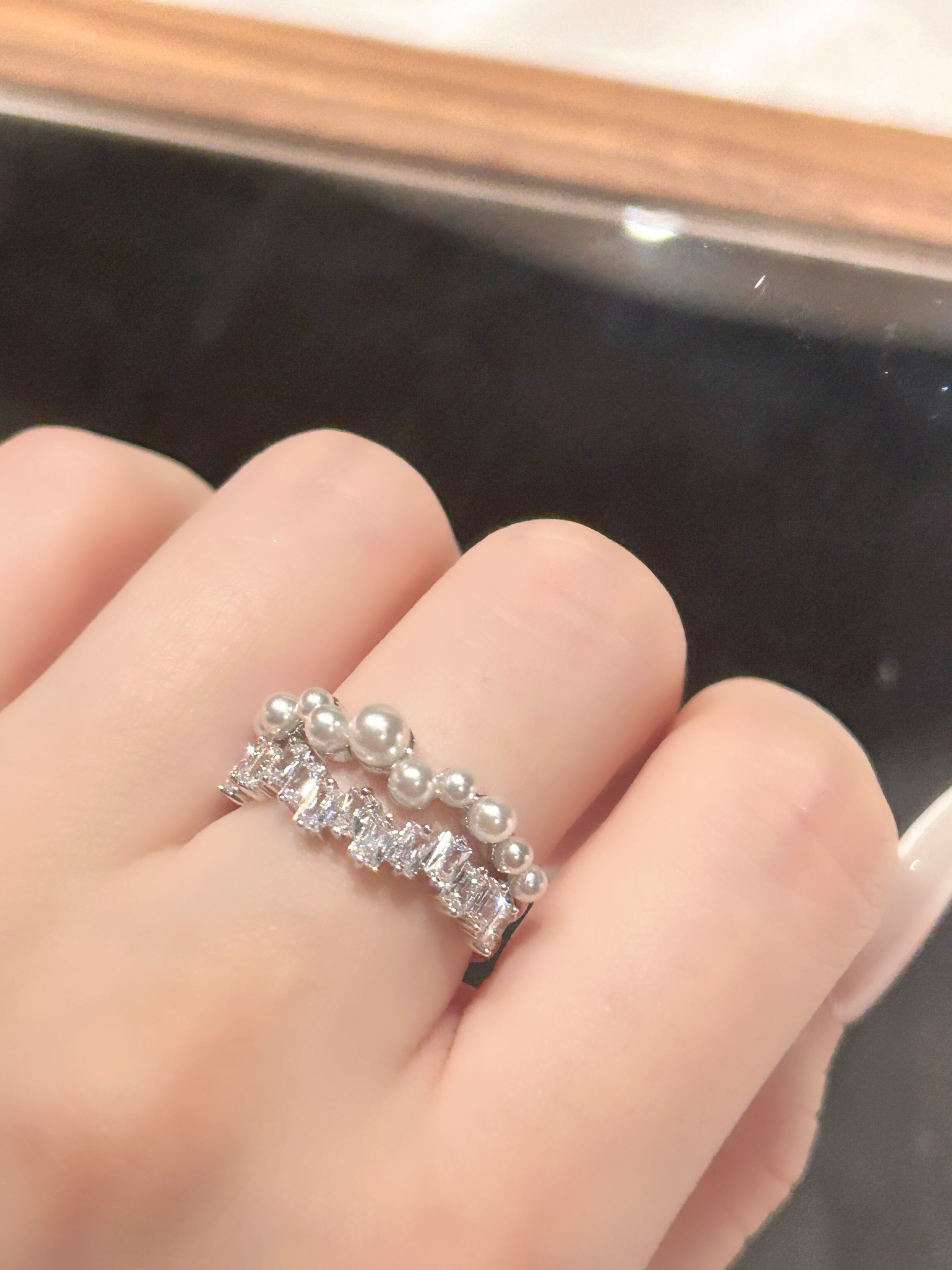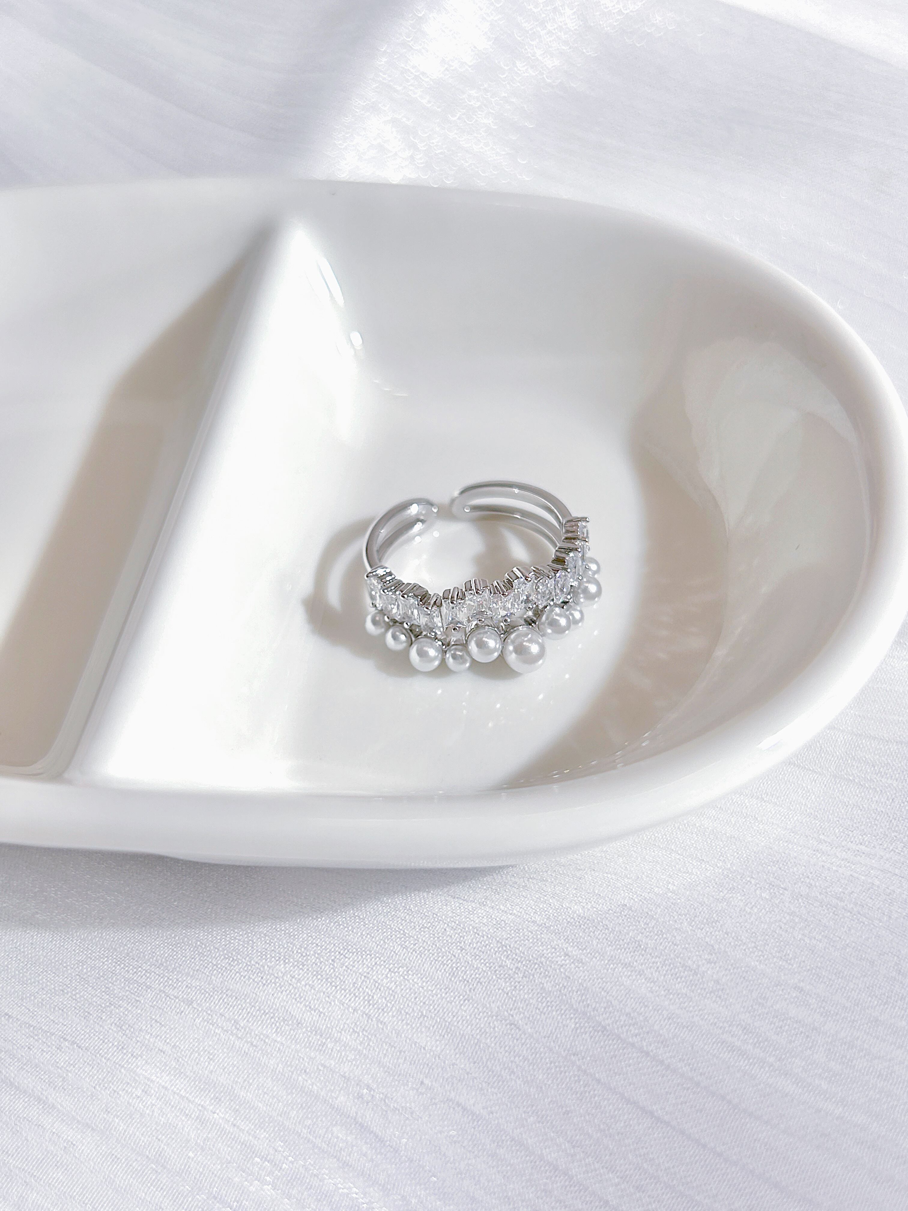 ジルコニアのきらめきと、パールのような優しい光沢が美しく重なり合うデザインリング。