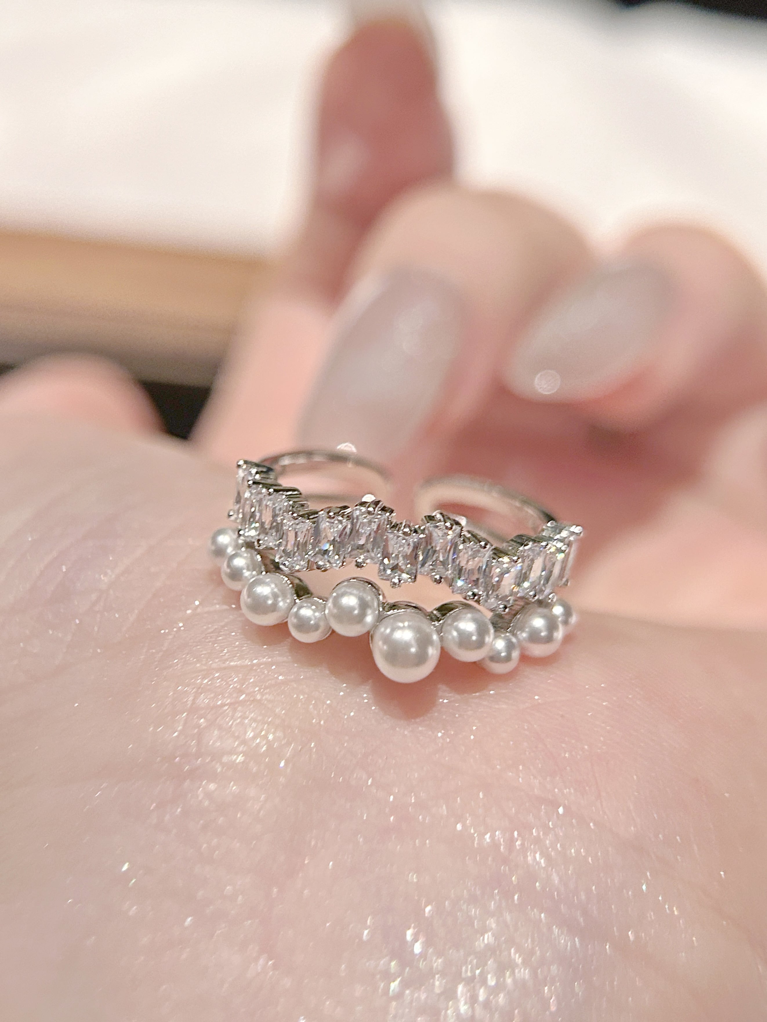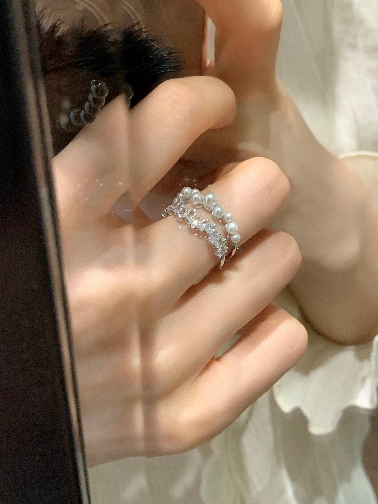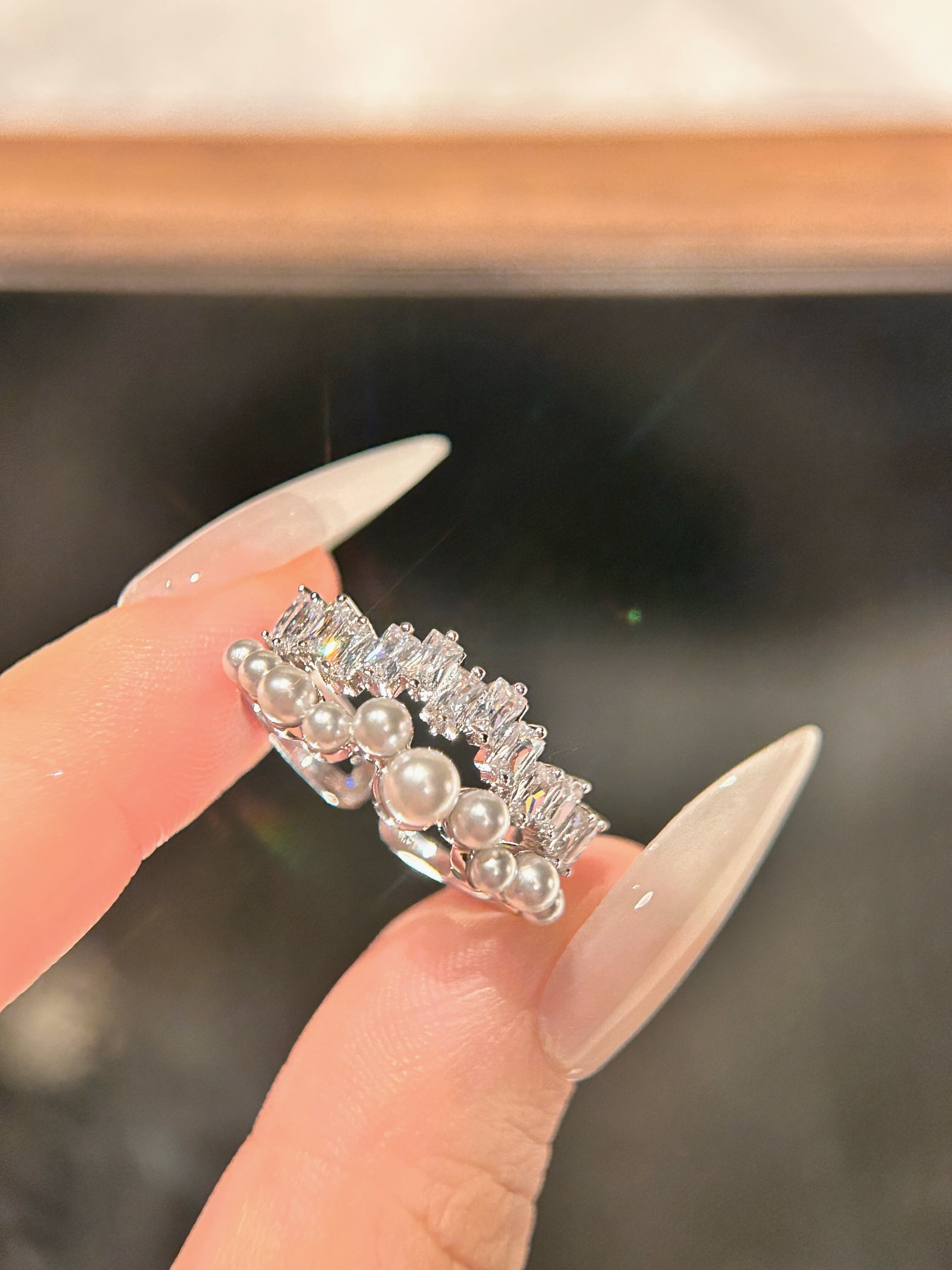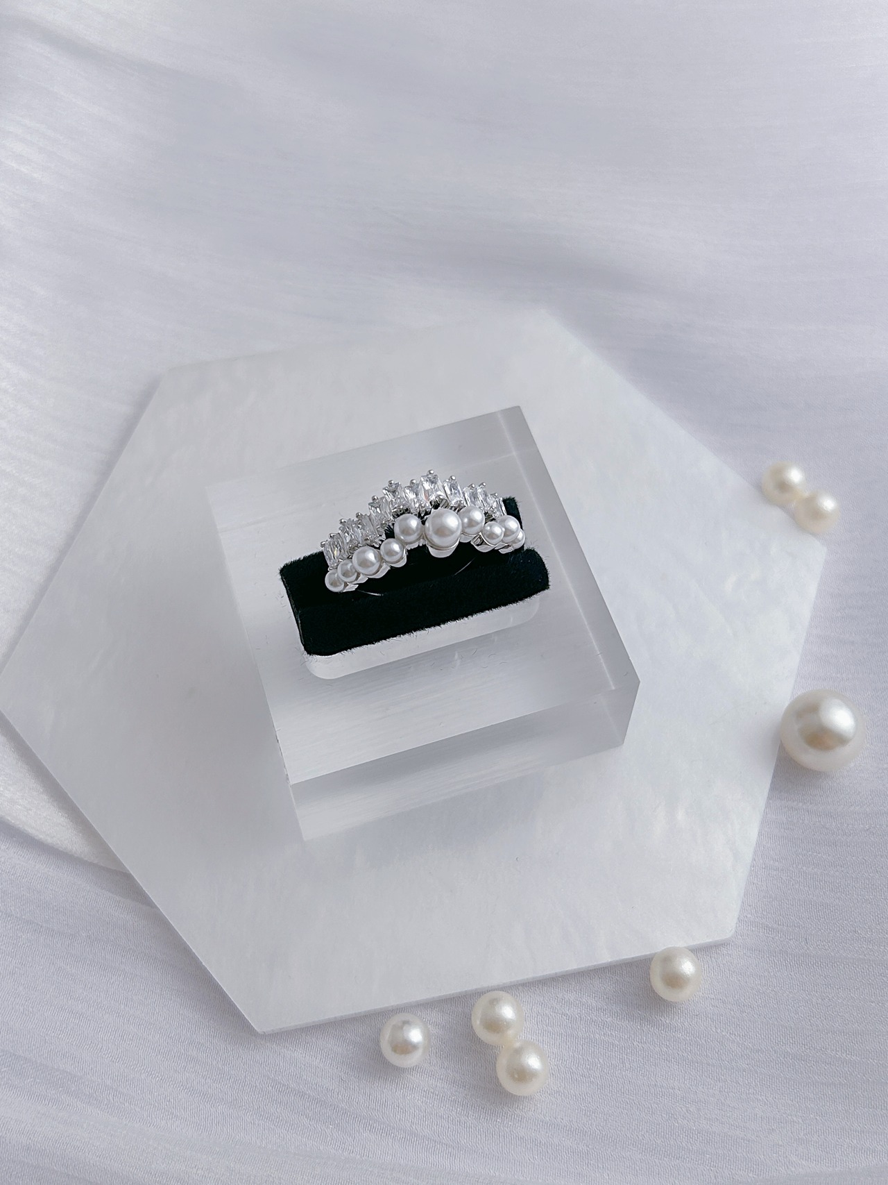 ジルコニアのきらめきと、パールのような優しい光沢が美しく重なり合うデザインリング。