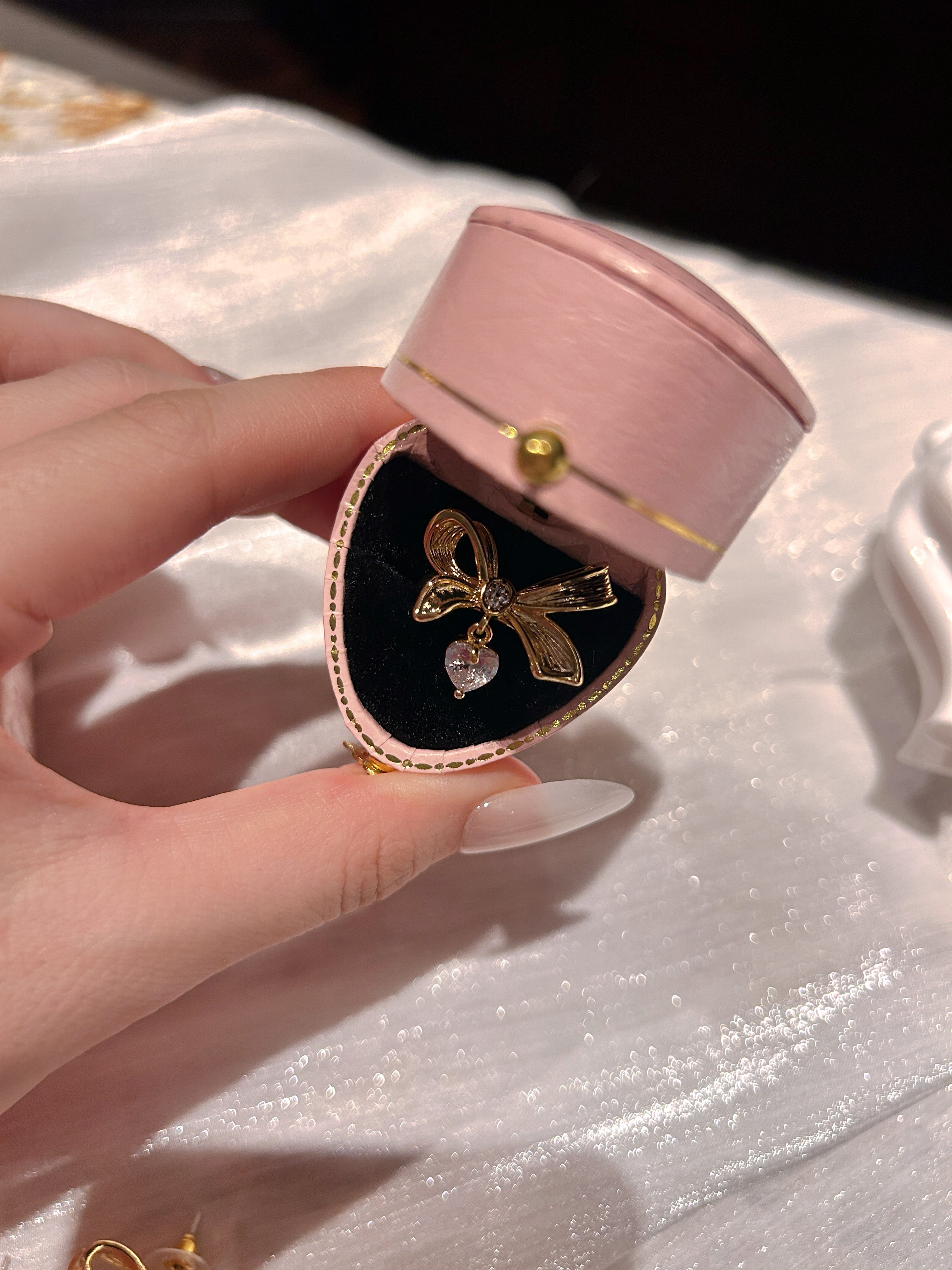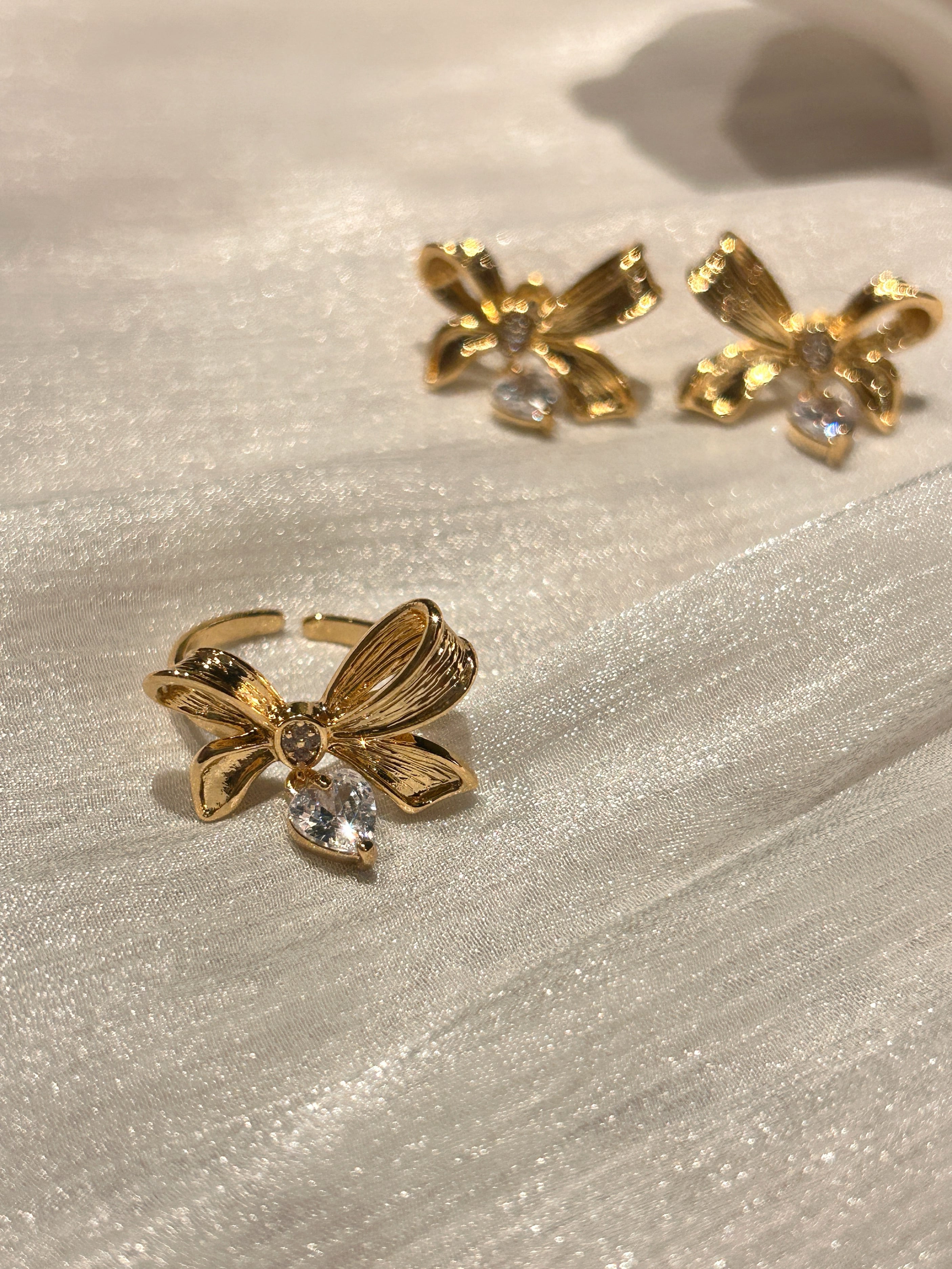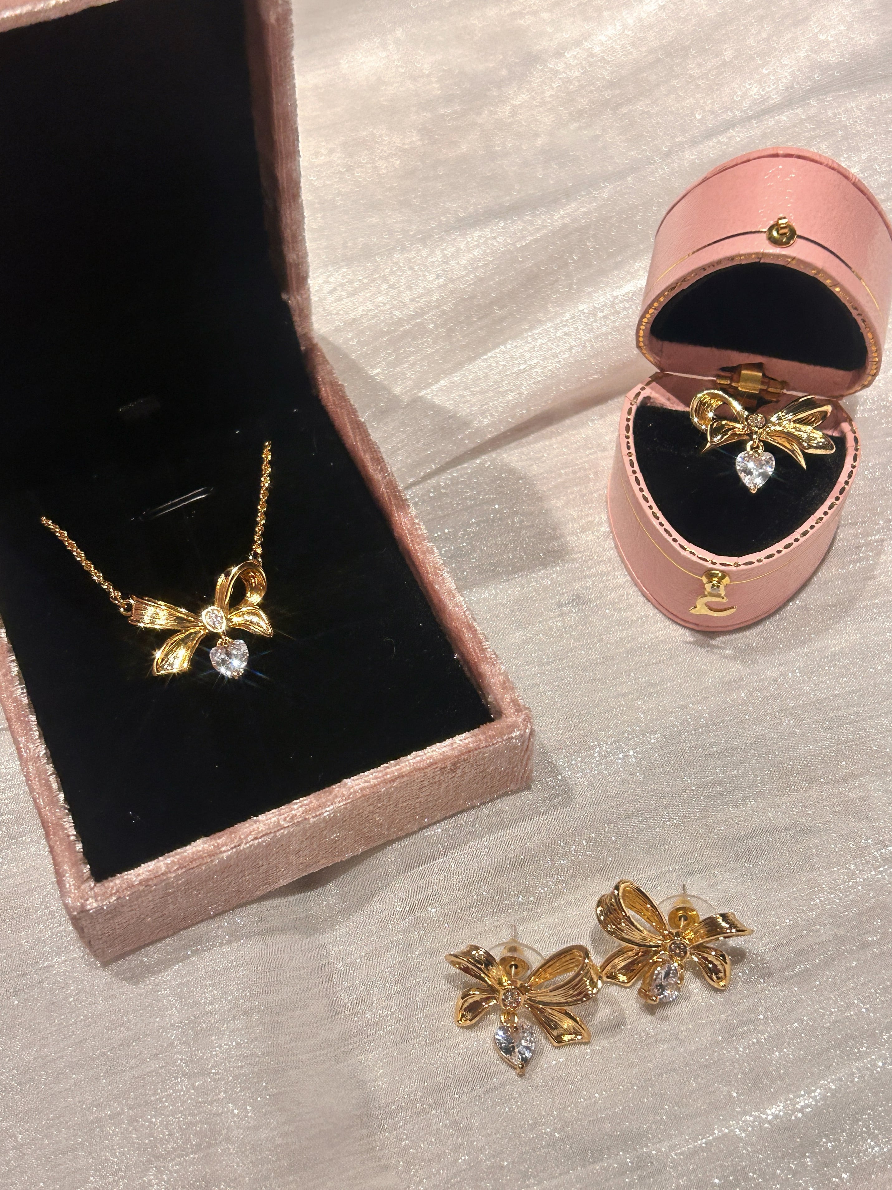 立体的なリボンモチーフに、ハート型ジルコニアが揺れる華やかなデザイン。