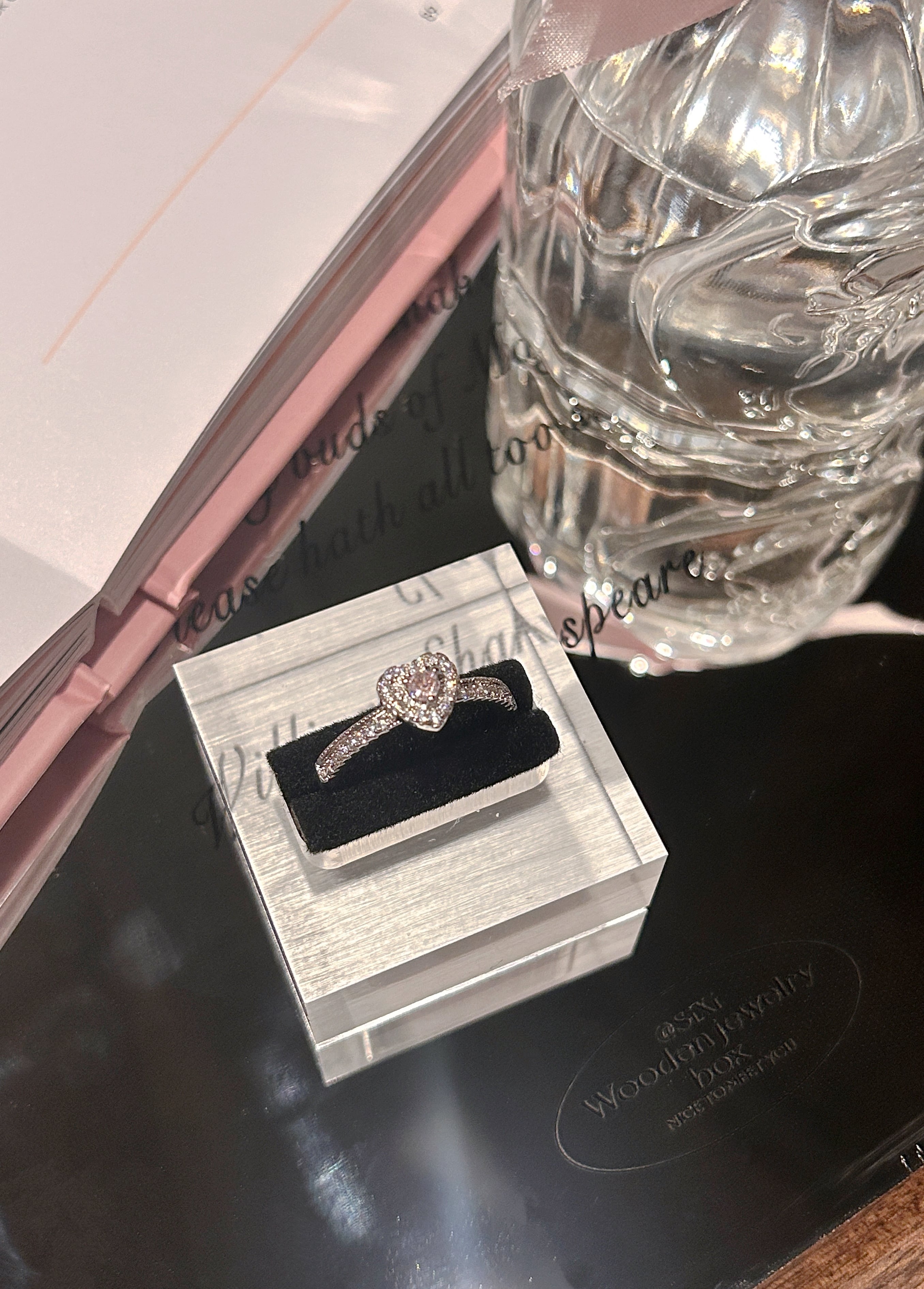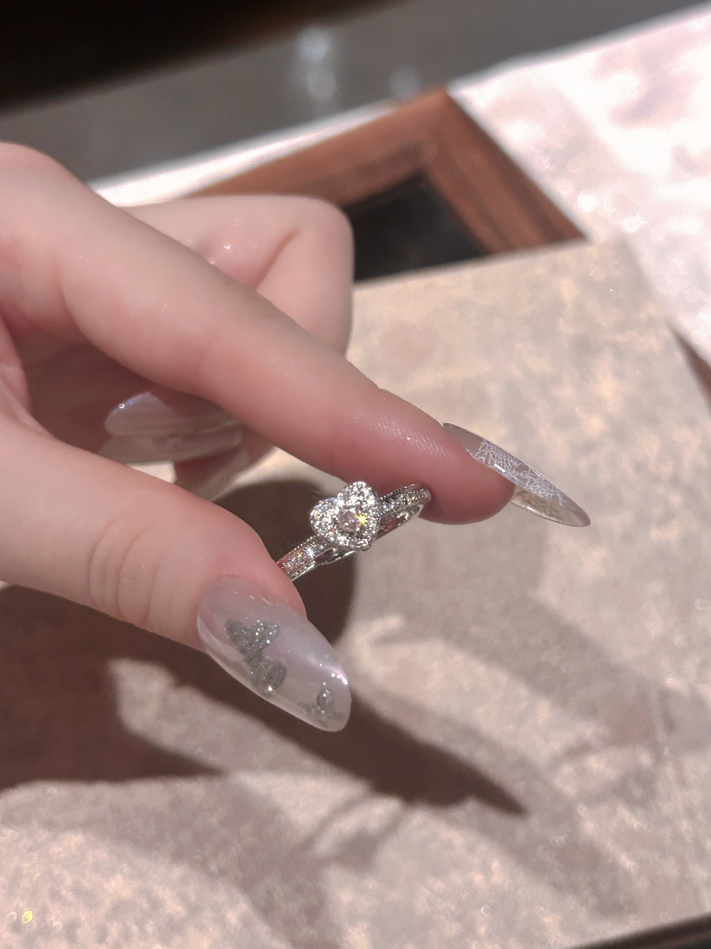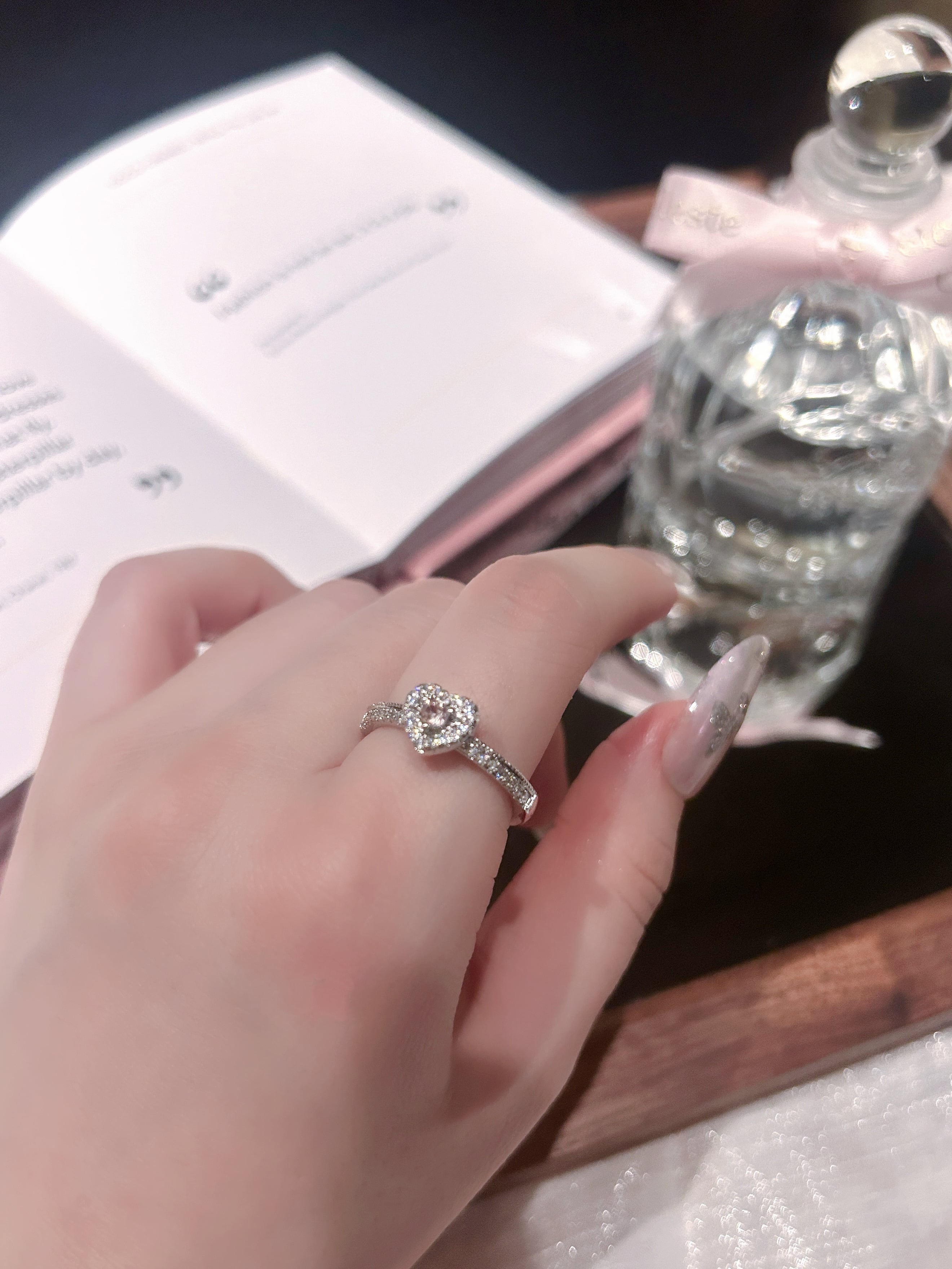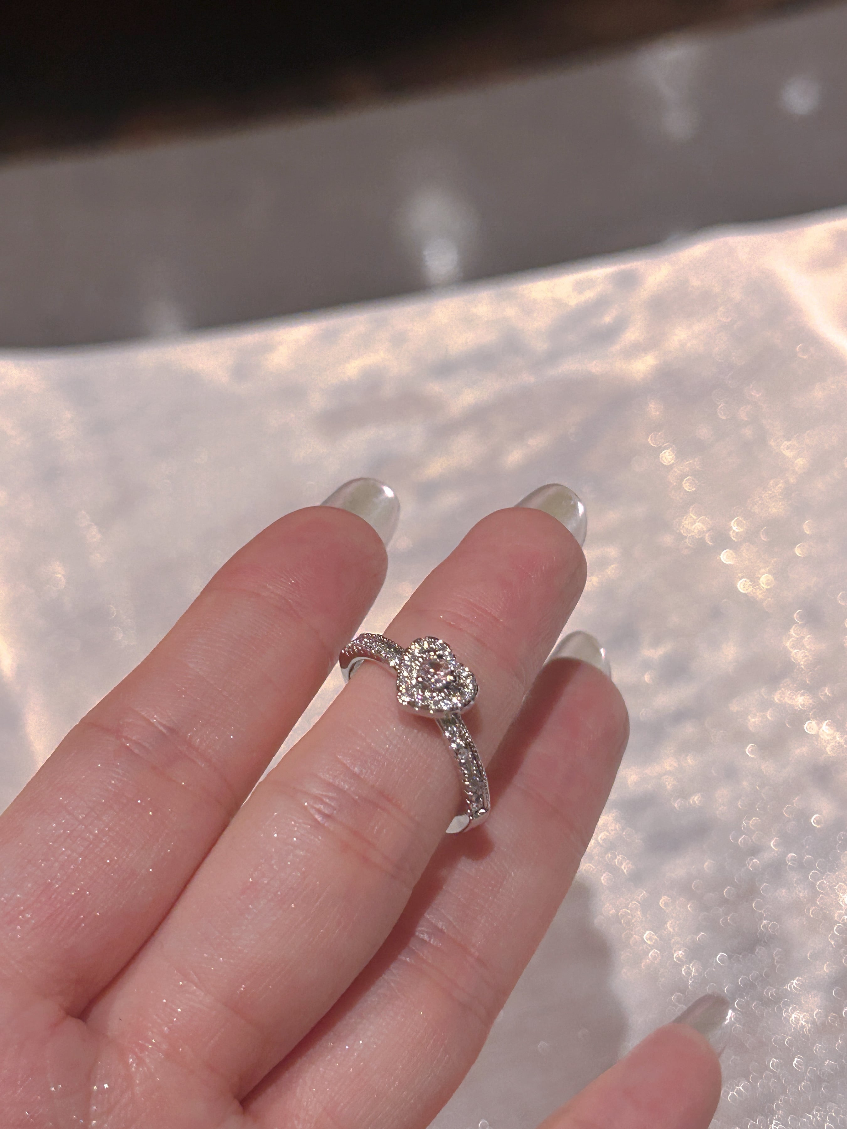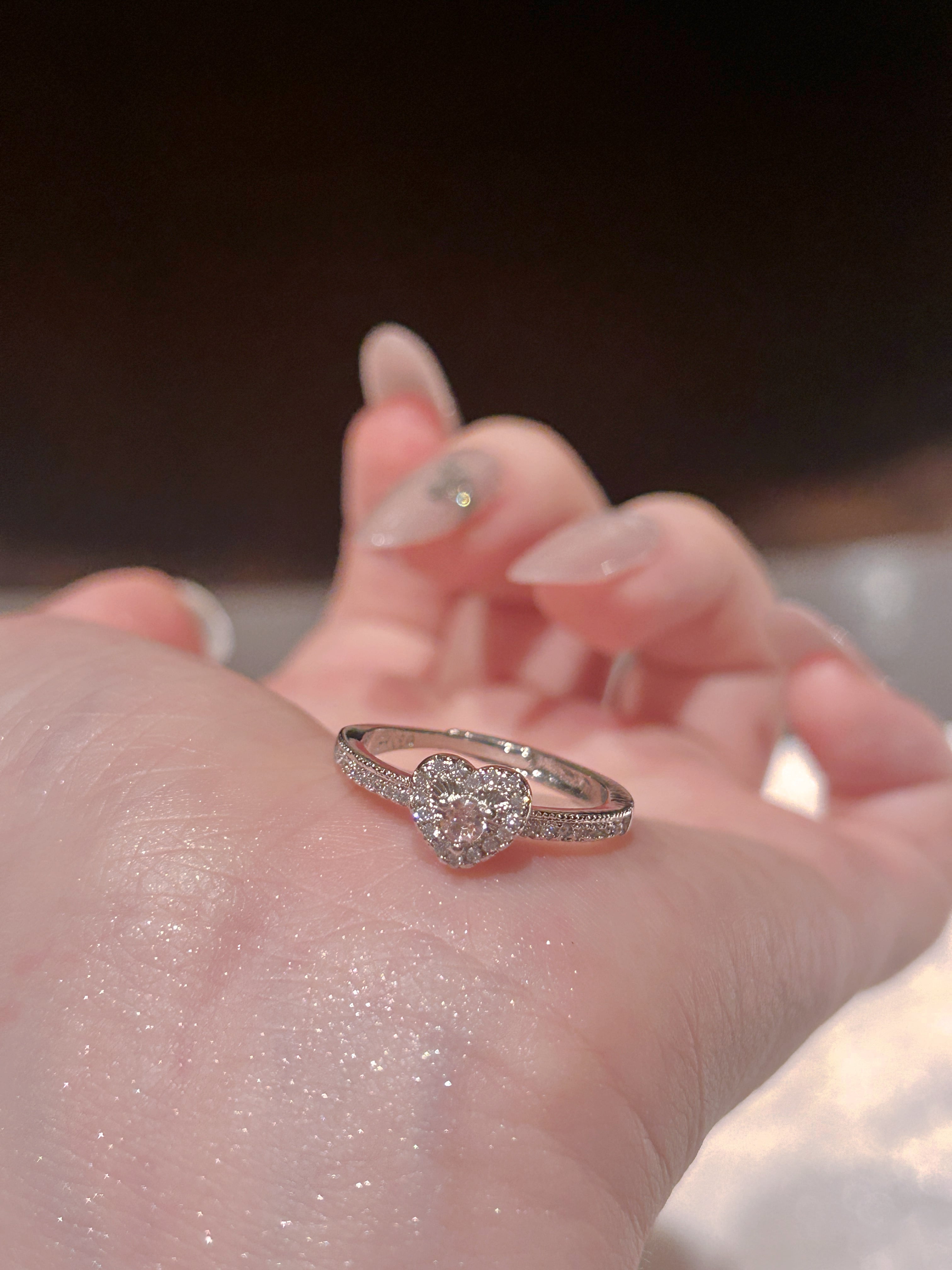 中心にきらめくハート型ストーンが主役の、乙女心くすぐるデザインリング。