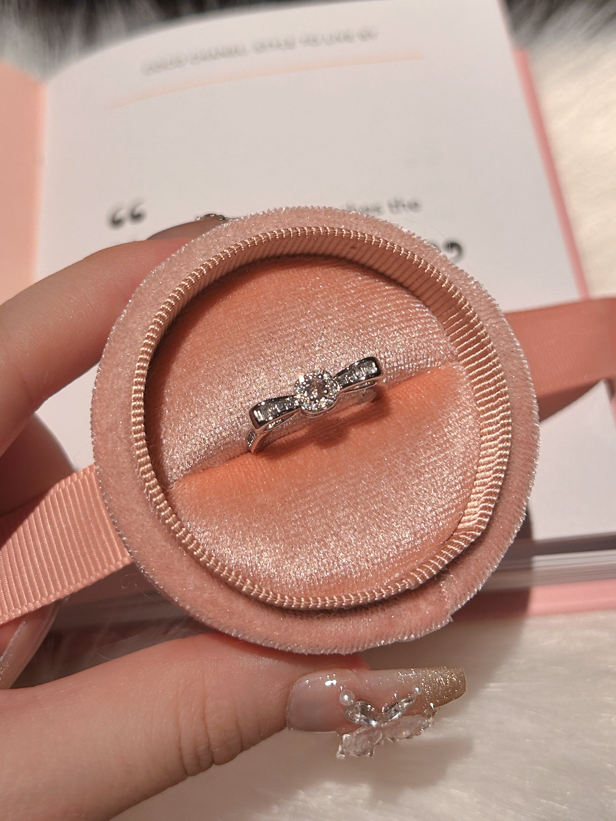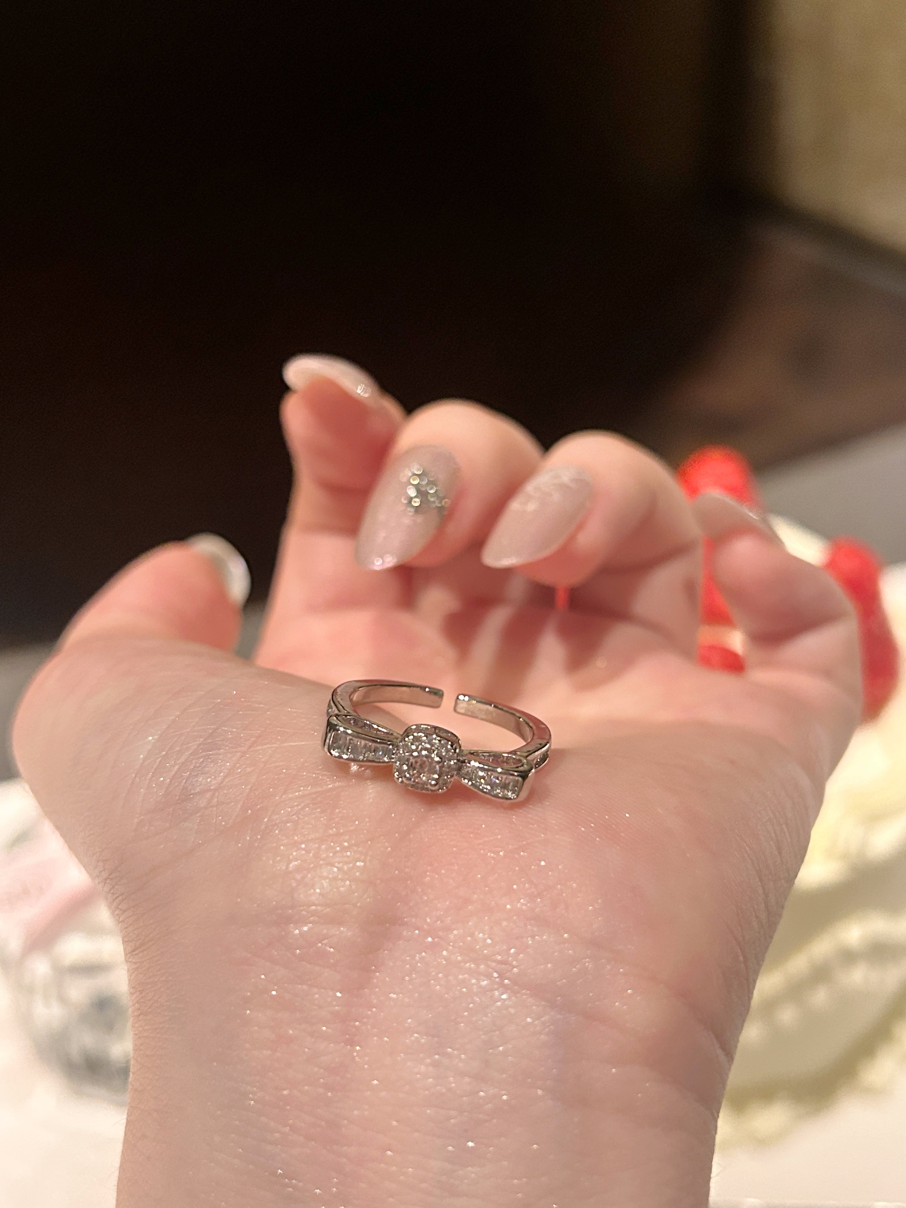 センターにあしらわれたラウンドカットのジルコニアが、まるでリボンのように上品に煌めくクラシカルデザインリング。サイドにも繊細に配されたストーンが、角度によって美しく光を反射し、手元をエレガントに演出します。