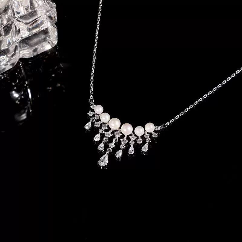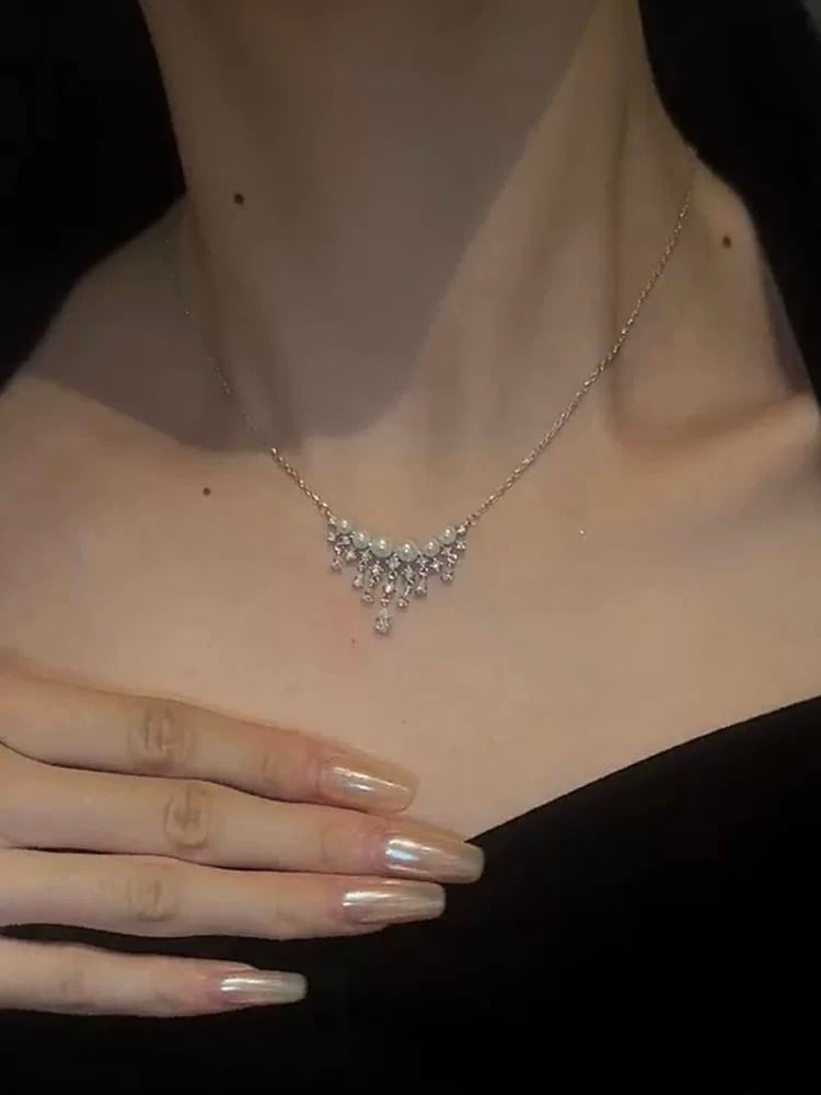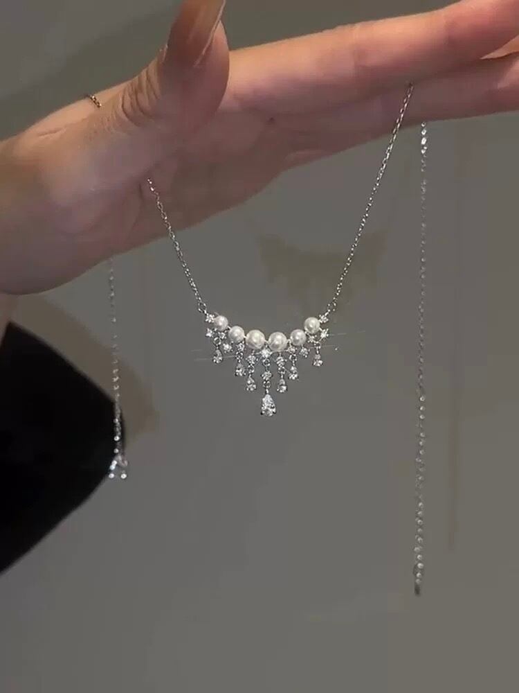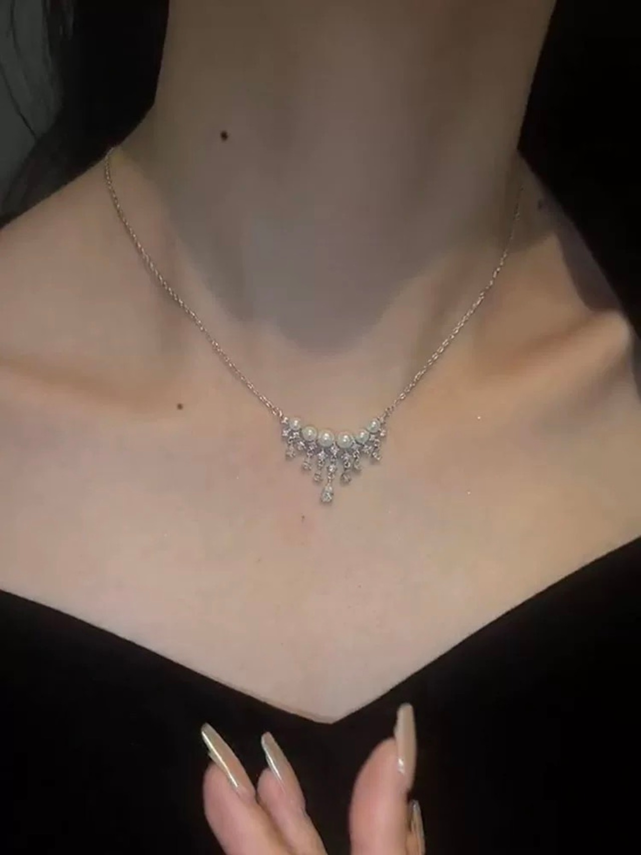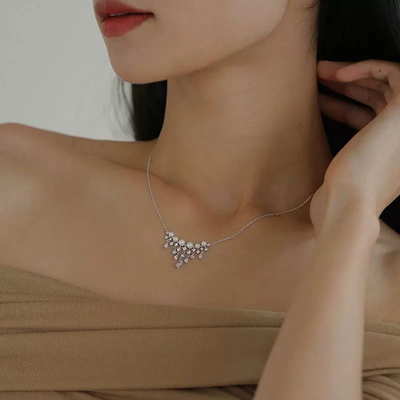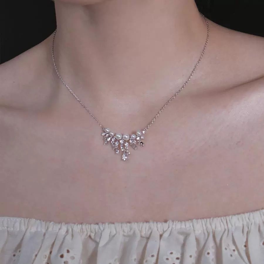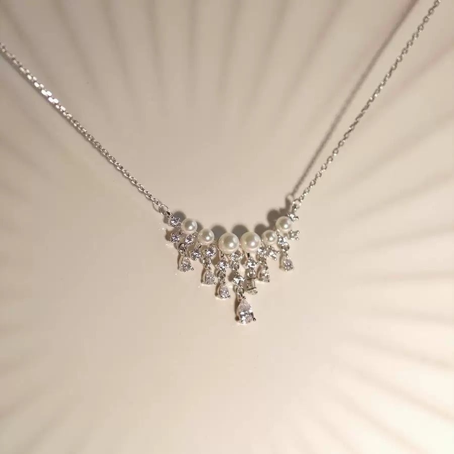 繊細な輝きと上品なパールが胸元を華やかに彩る、エレガントなネックレス。