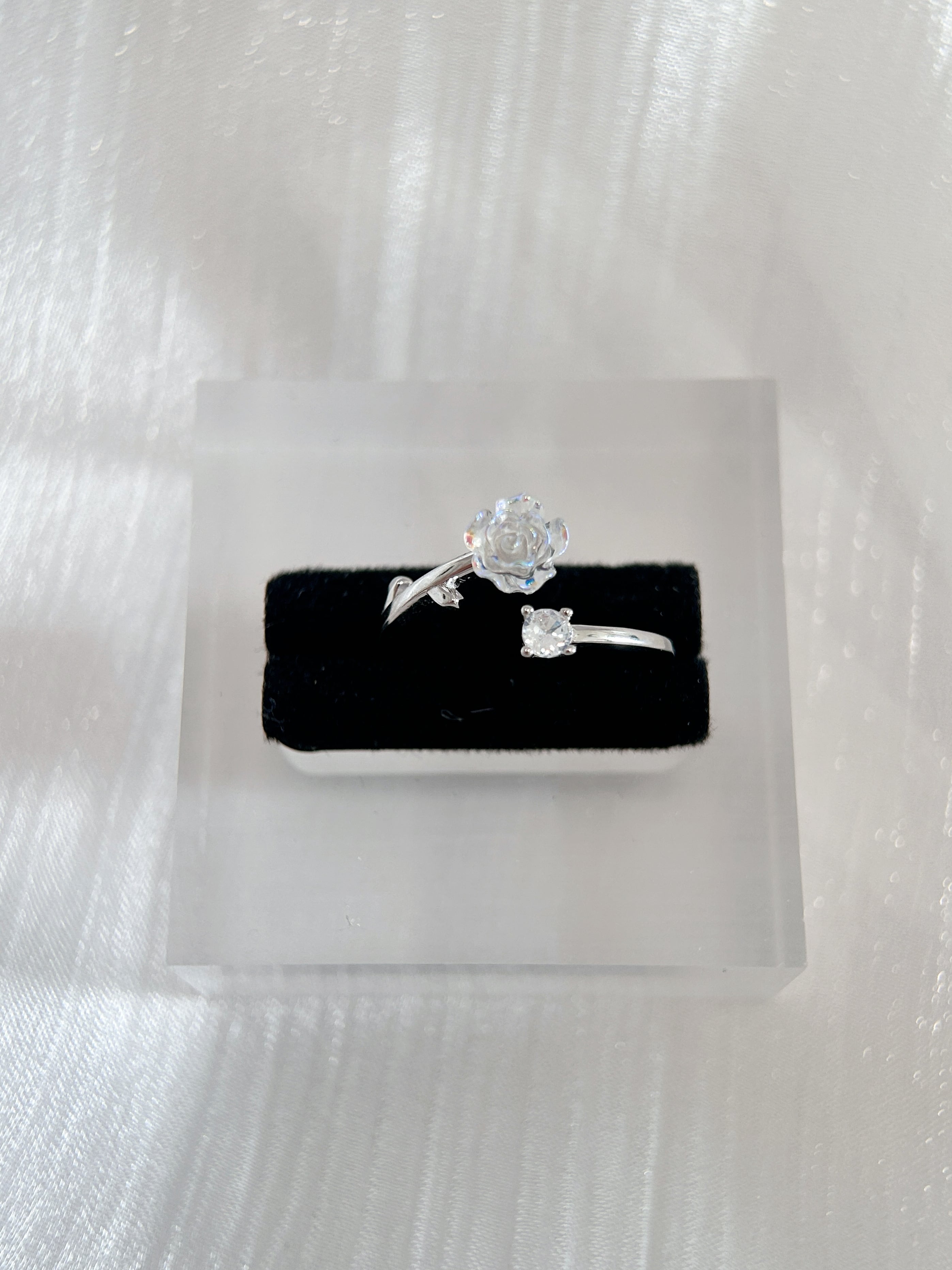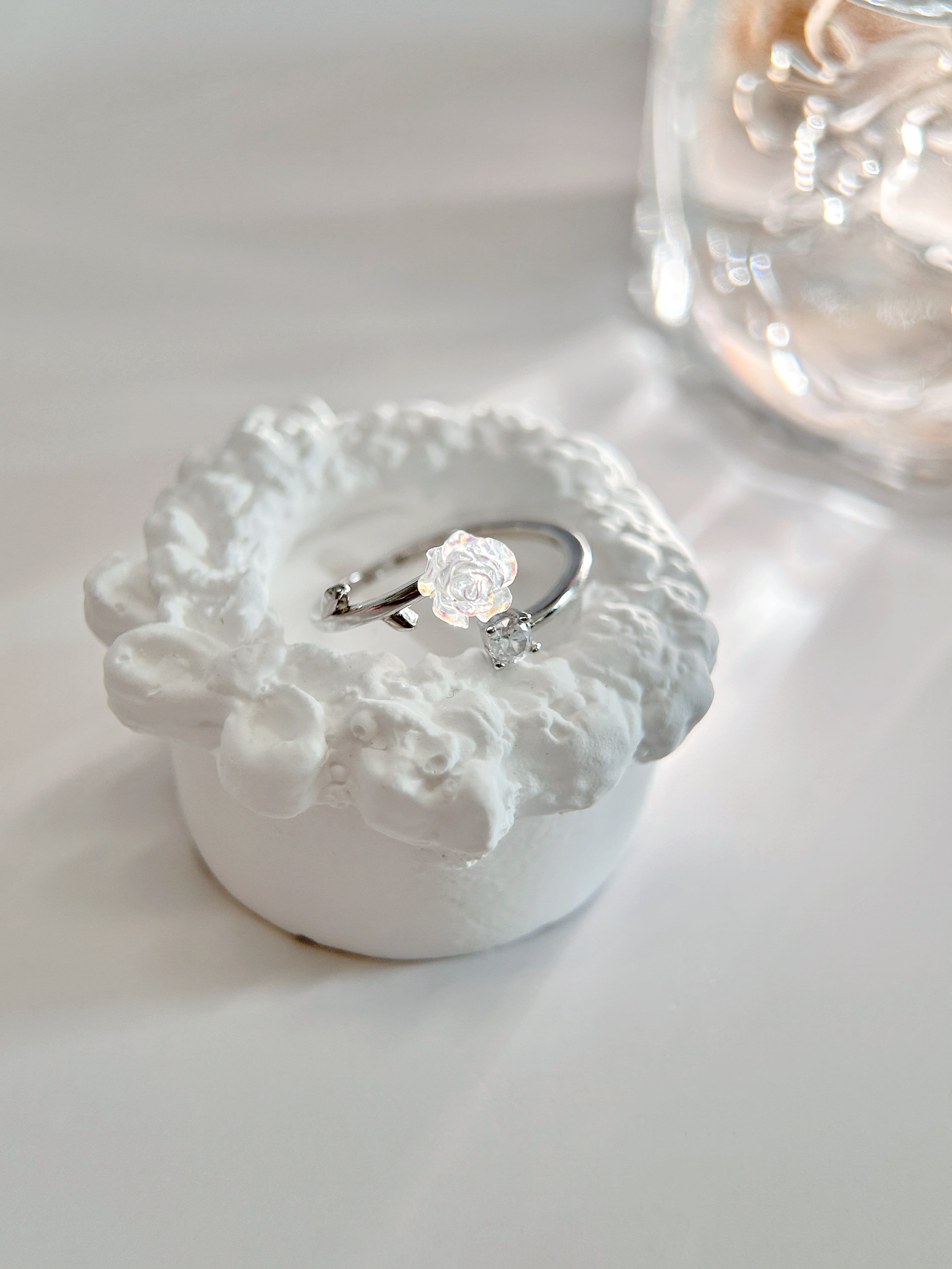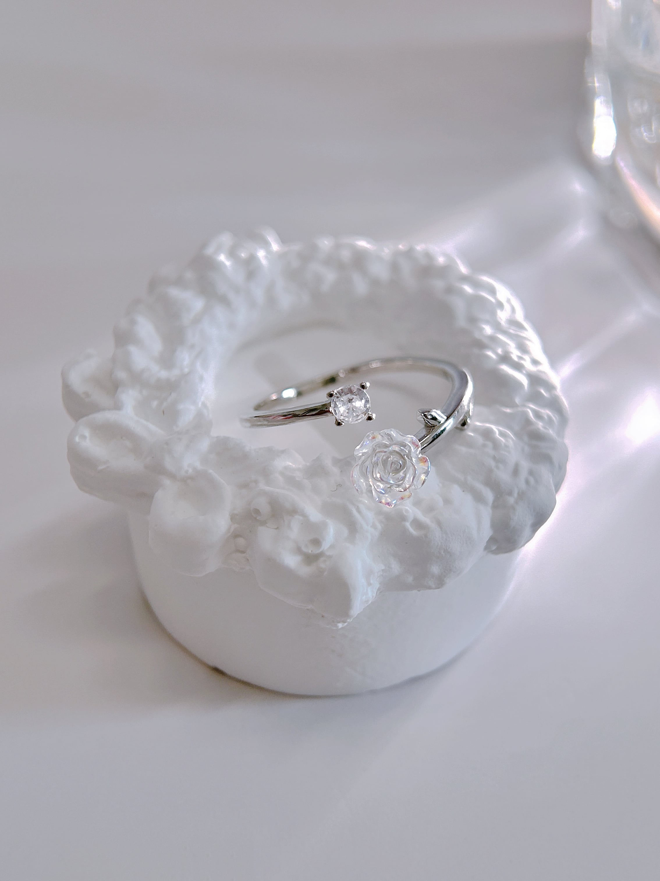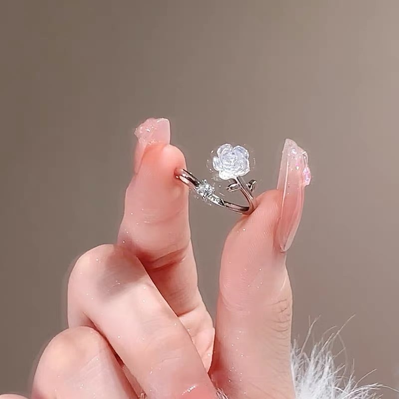 透明感あふれるローズモチーフが可憐に輝く、S925シルバーのオープンリング。
