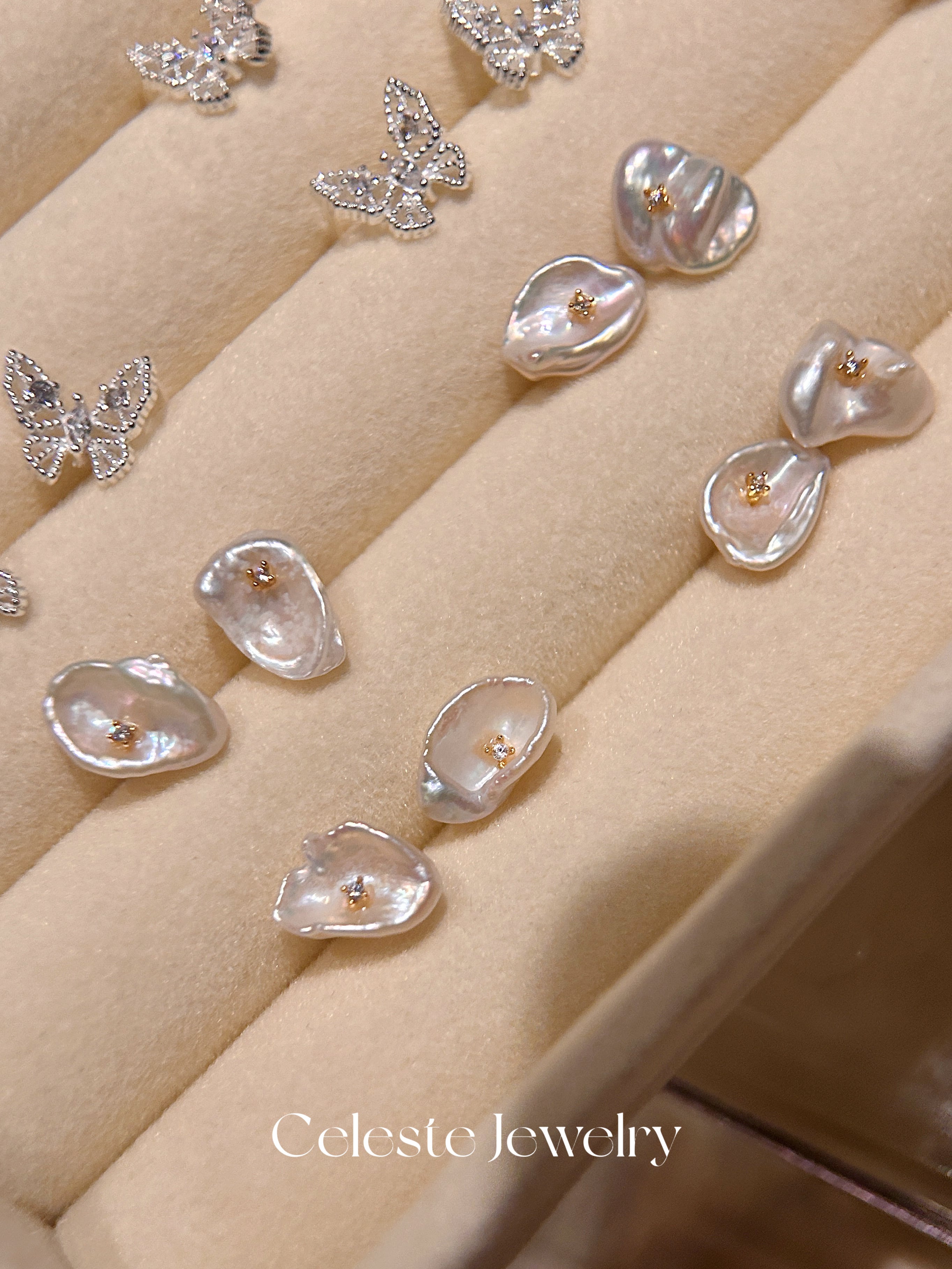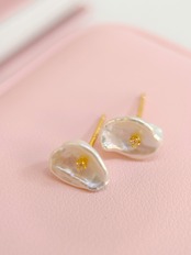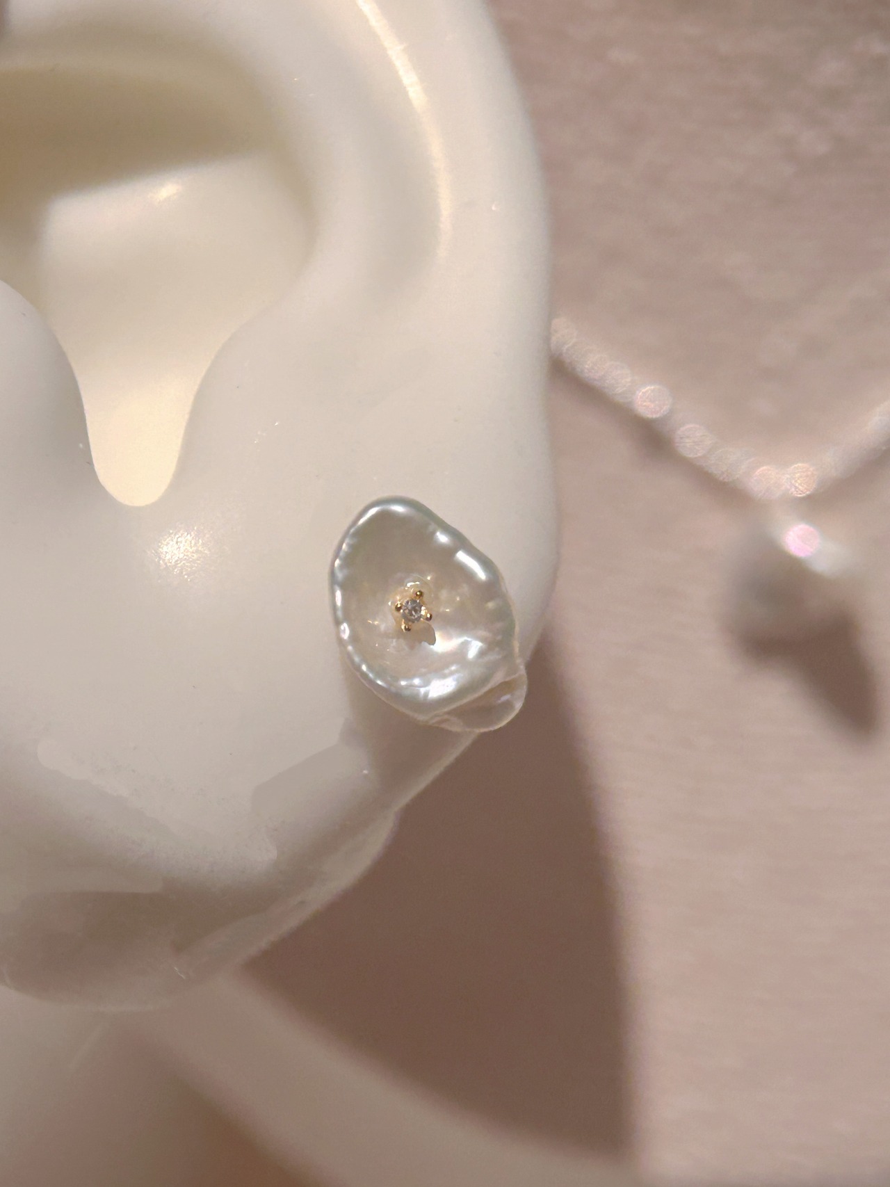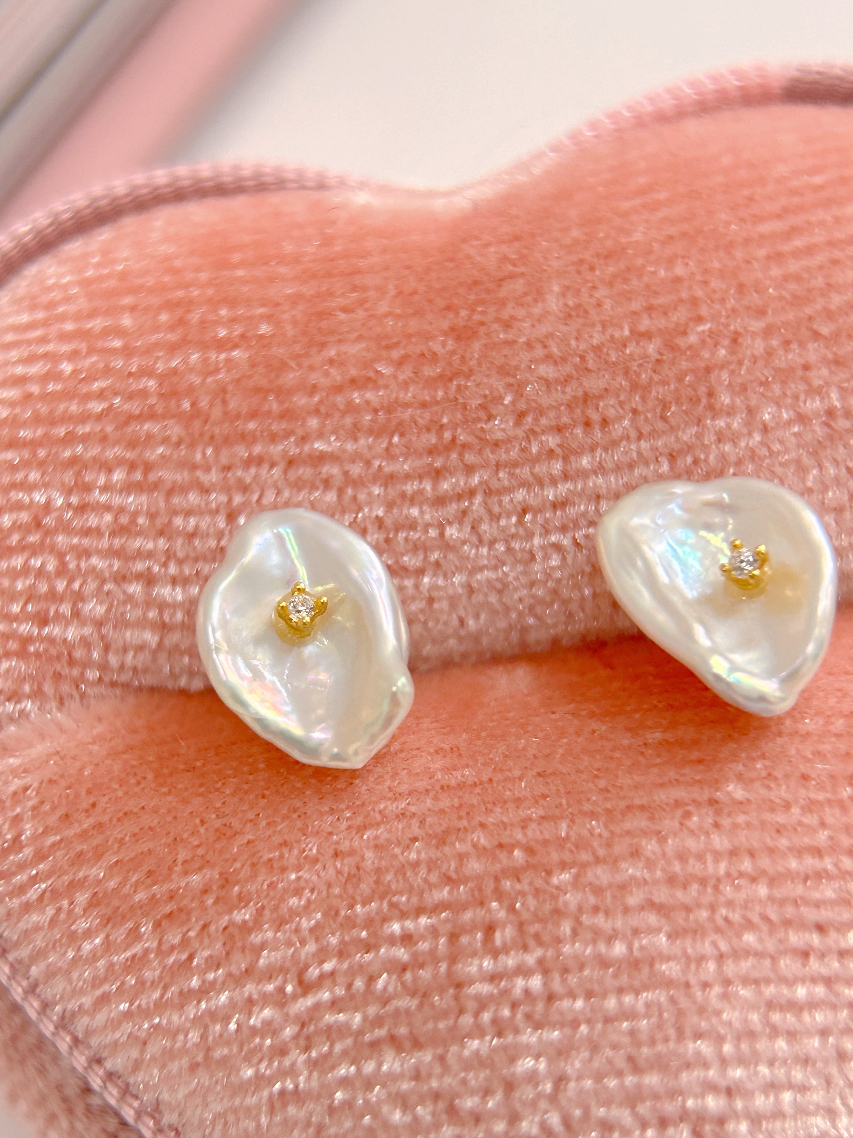 柔らかな光沢と唯一無二のフォルムが美しい、バロックパールピアスです。