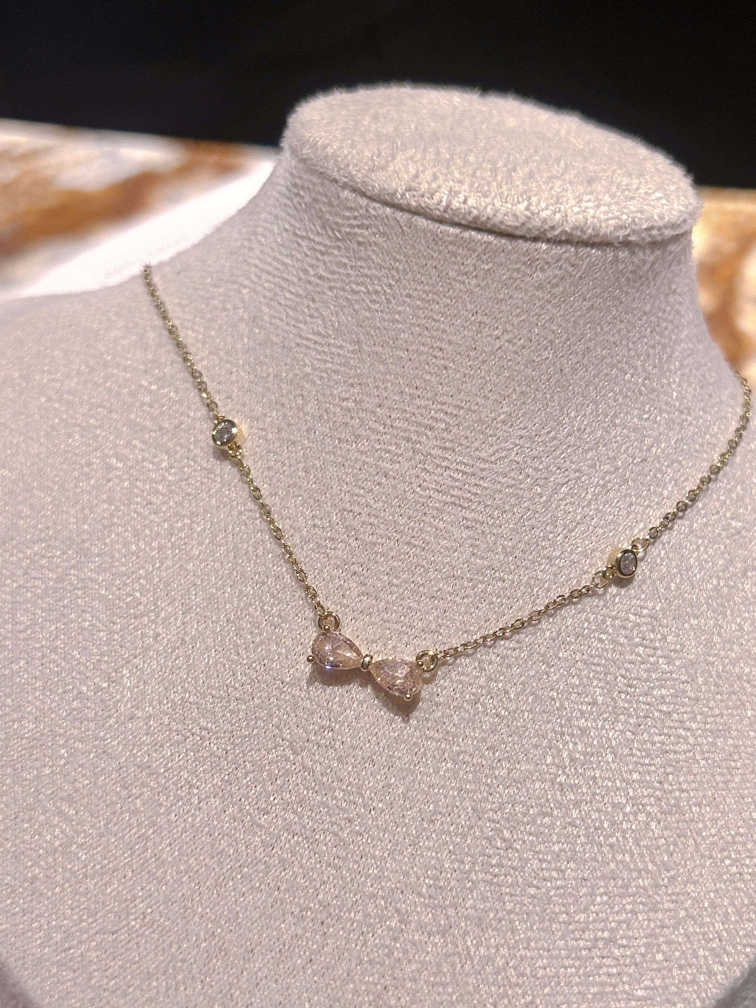 甘くなりがちなリボンモチーフを、繊細なラインとゴールドの煌めきで「大人の女性」に似合う気品ある表情に。肌に溶け込むような華奢なチェーンが、鎖骨を美しく引き立てます。
