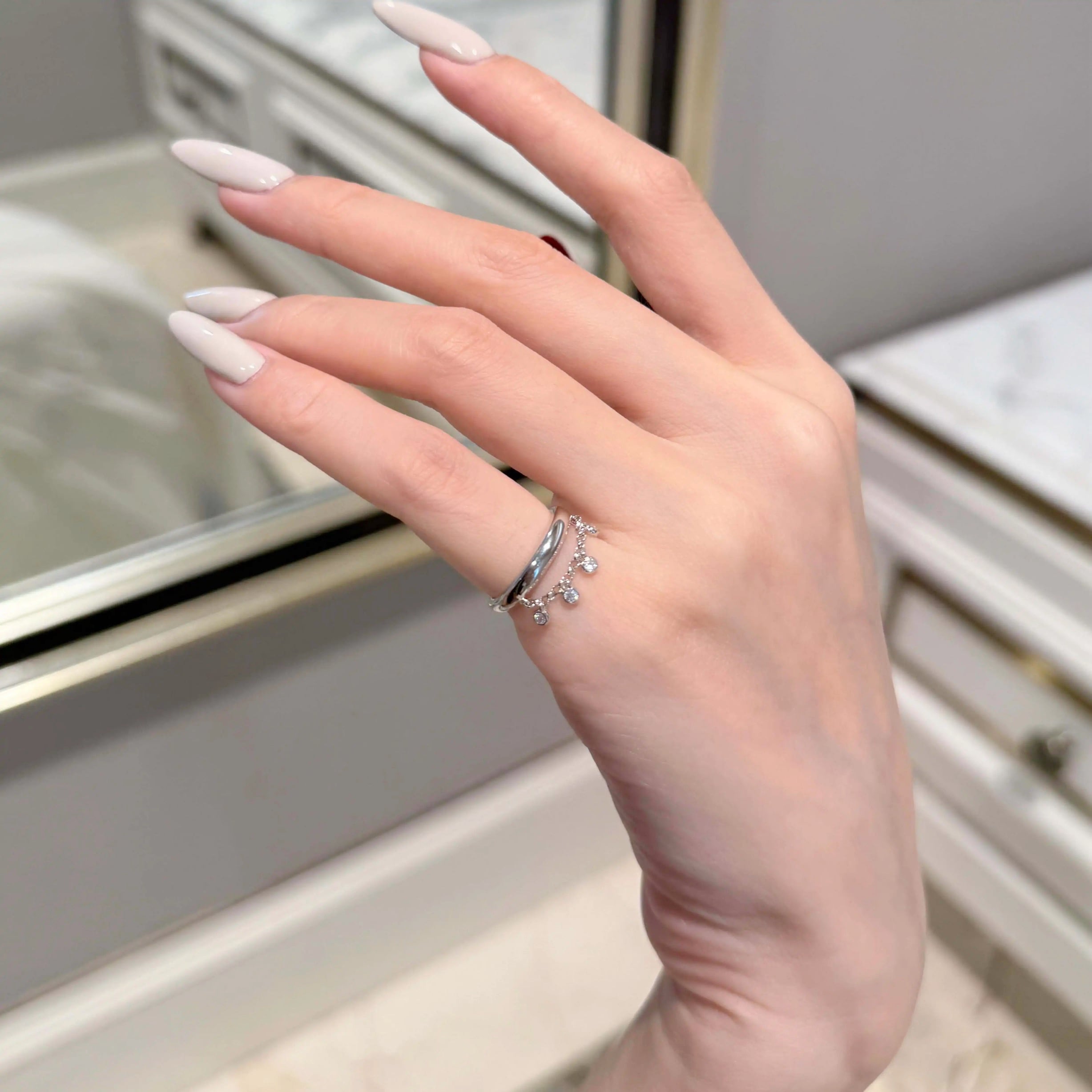洗練されたシルバーのダブルラインに、繊細なチャームが揺れる「流れるような輝き」を纏ったリング。