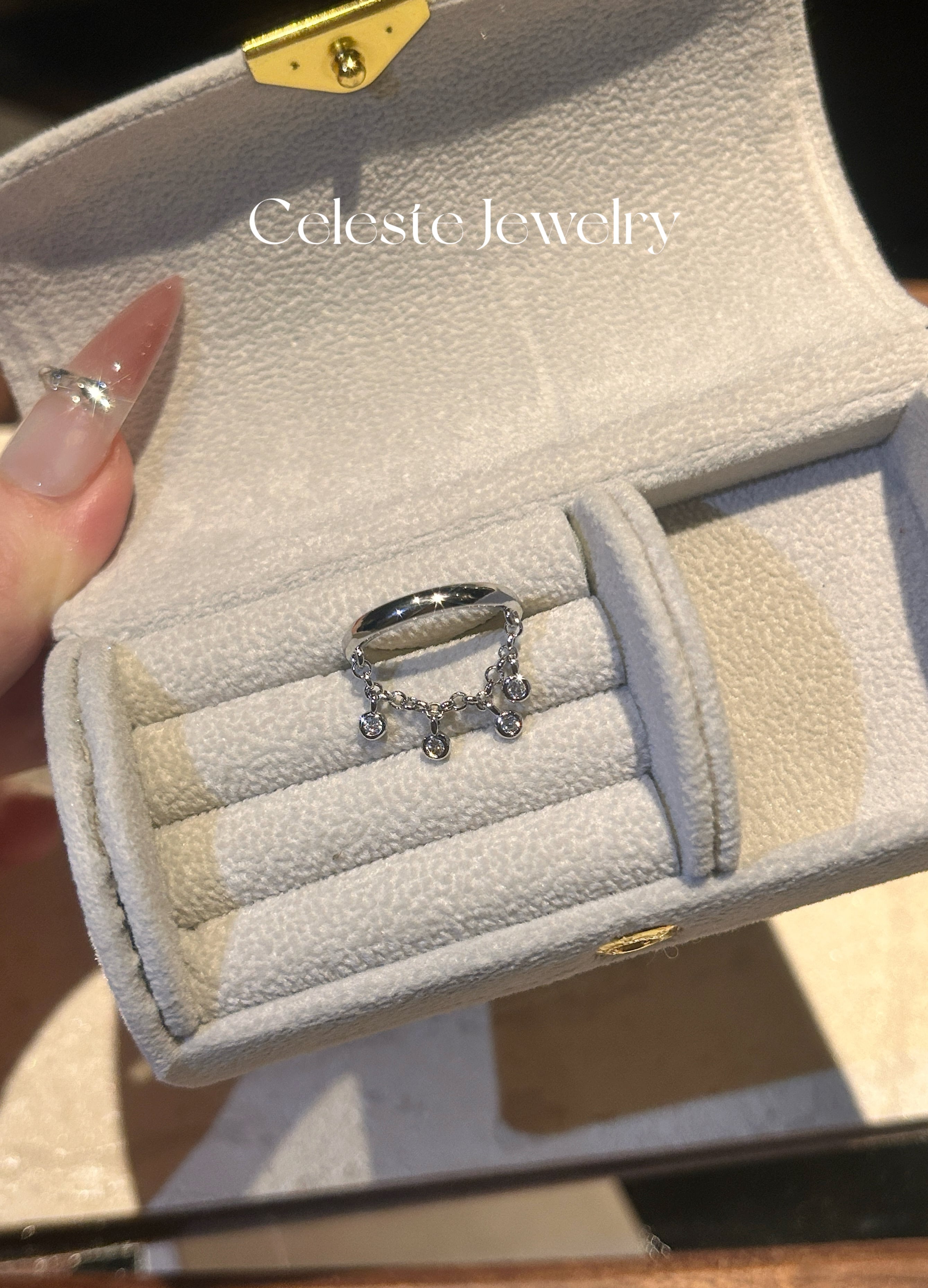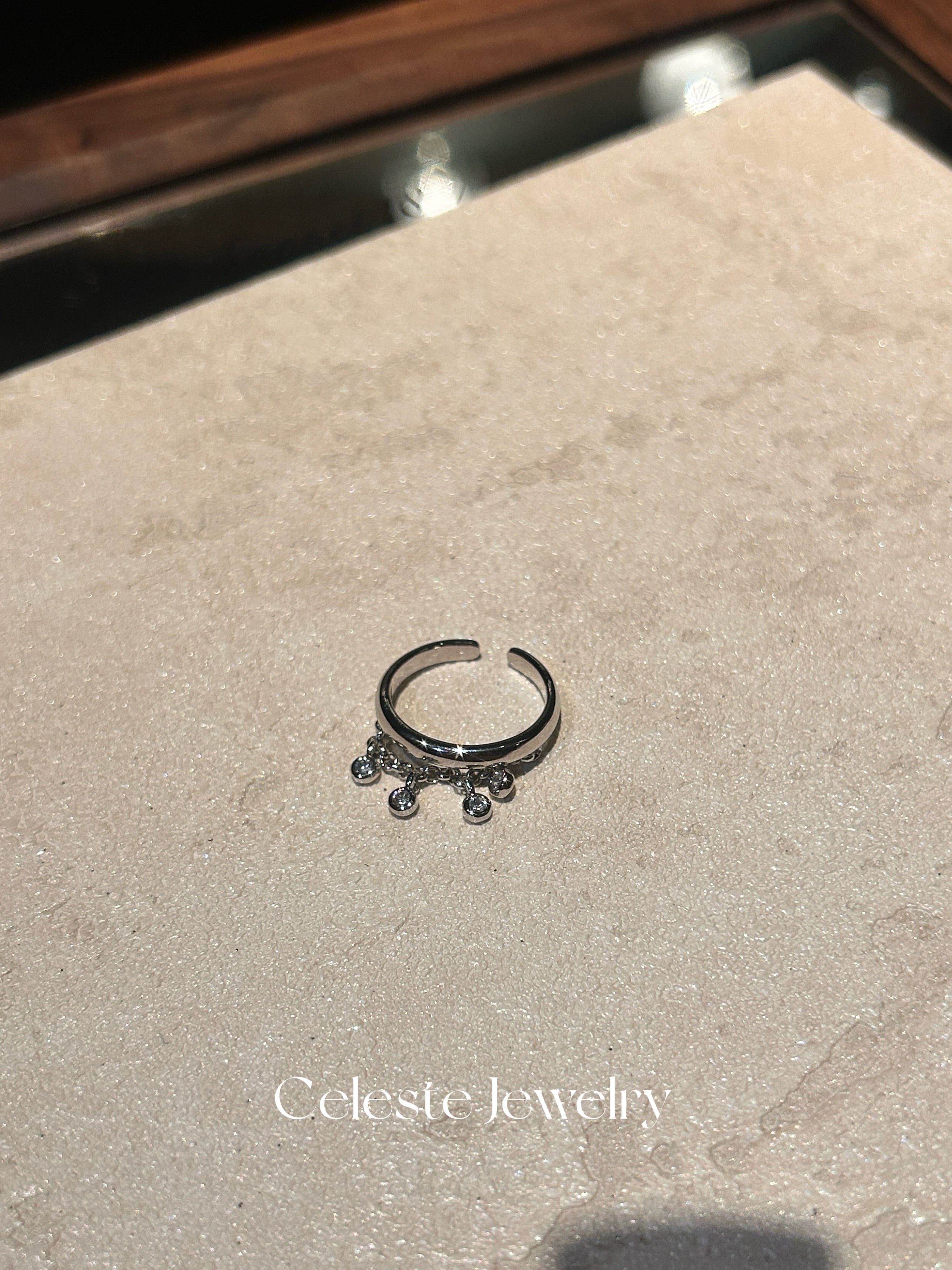 指を動かすたびに、小さなジルコニアが光を反射してキラキラと揺れ、手元にドラマチックな表情をプラスします。