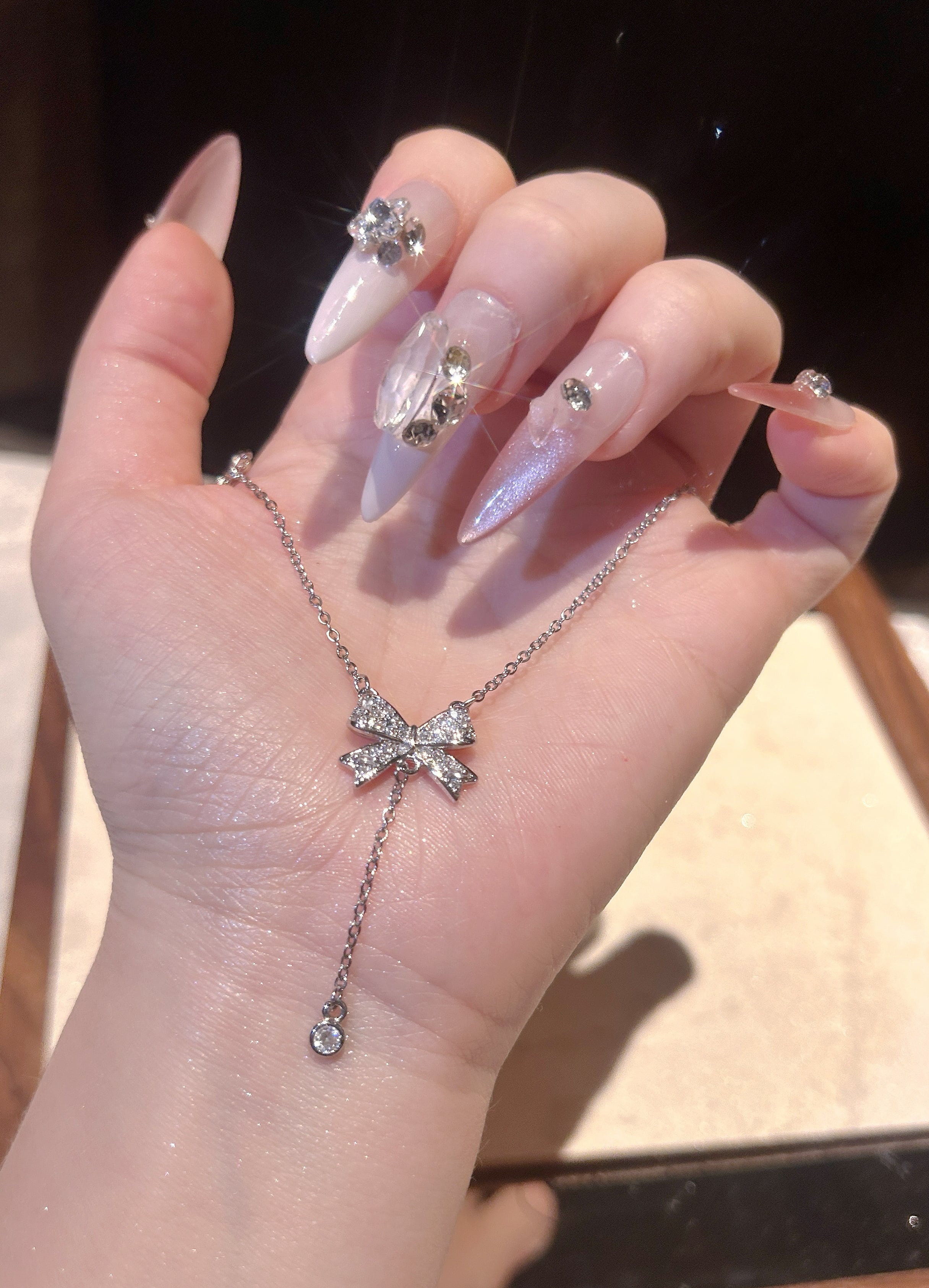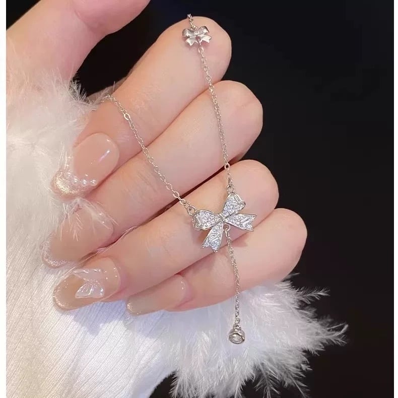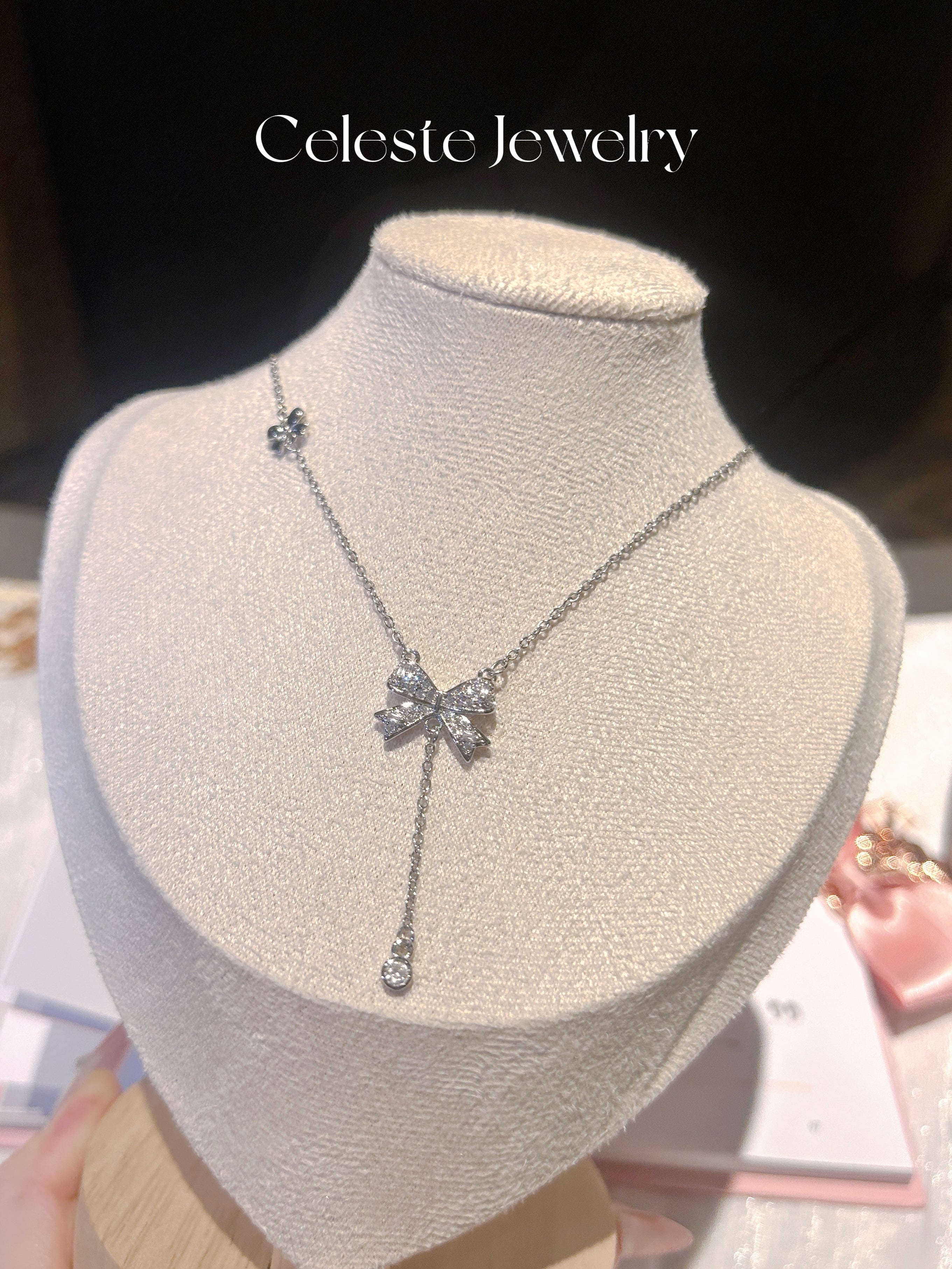 繊細な輝きを放つリボンモチーフに、スッと伸びるタッセルを添えた大人可愛いネックレスです。