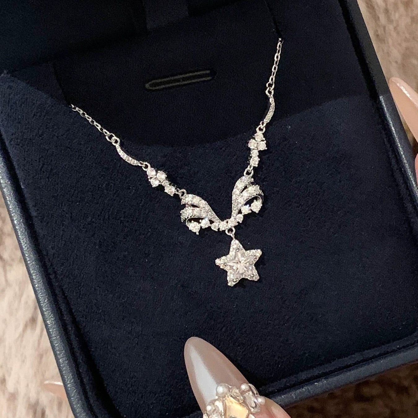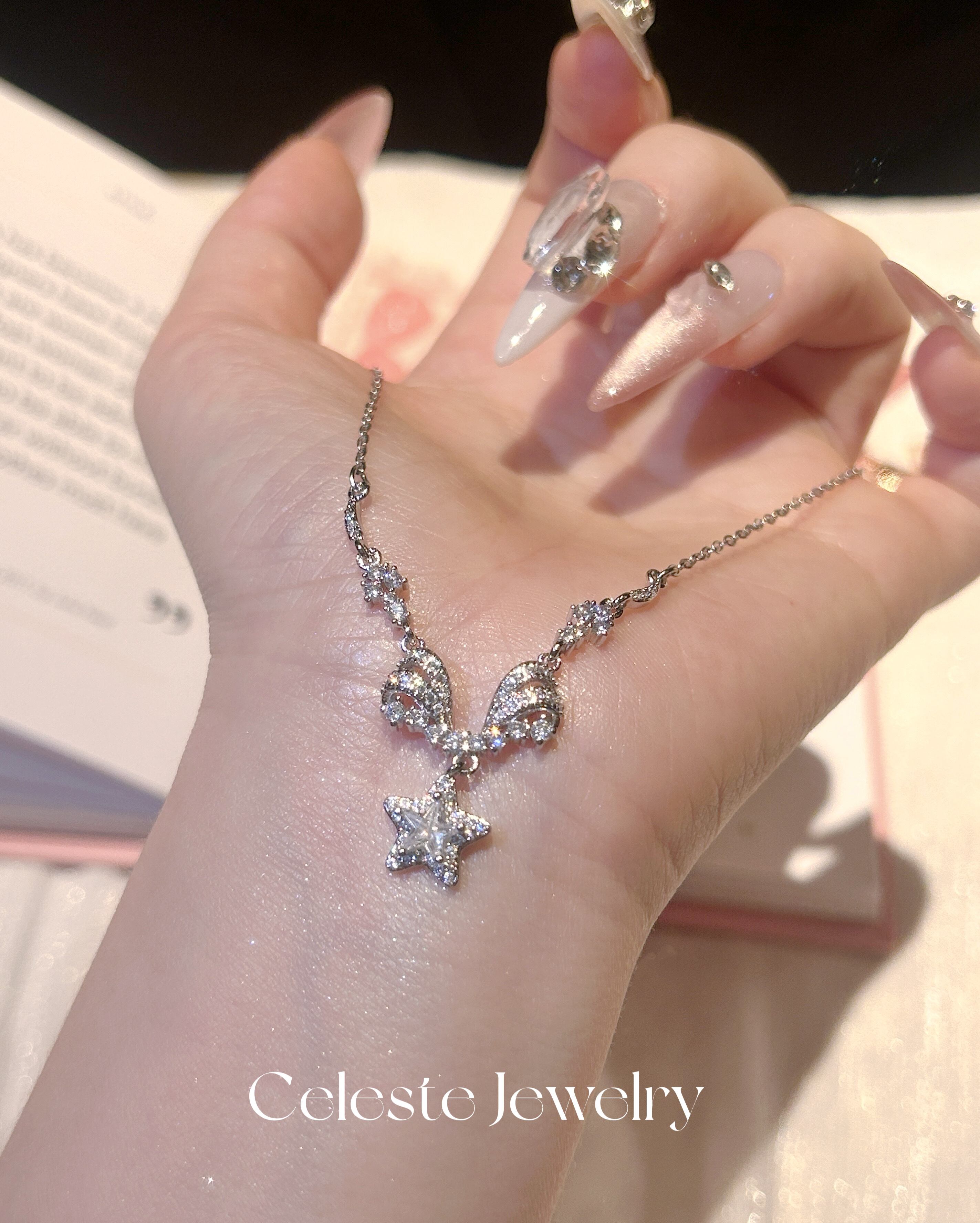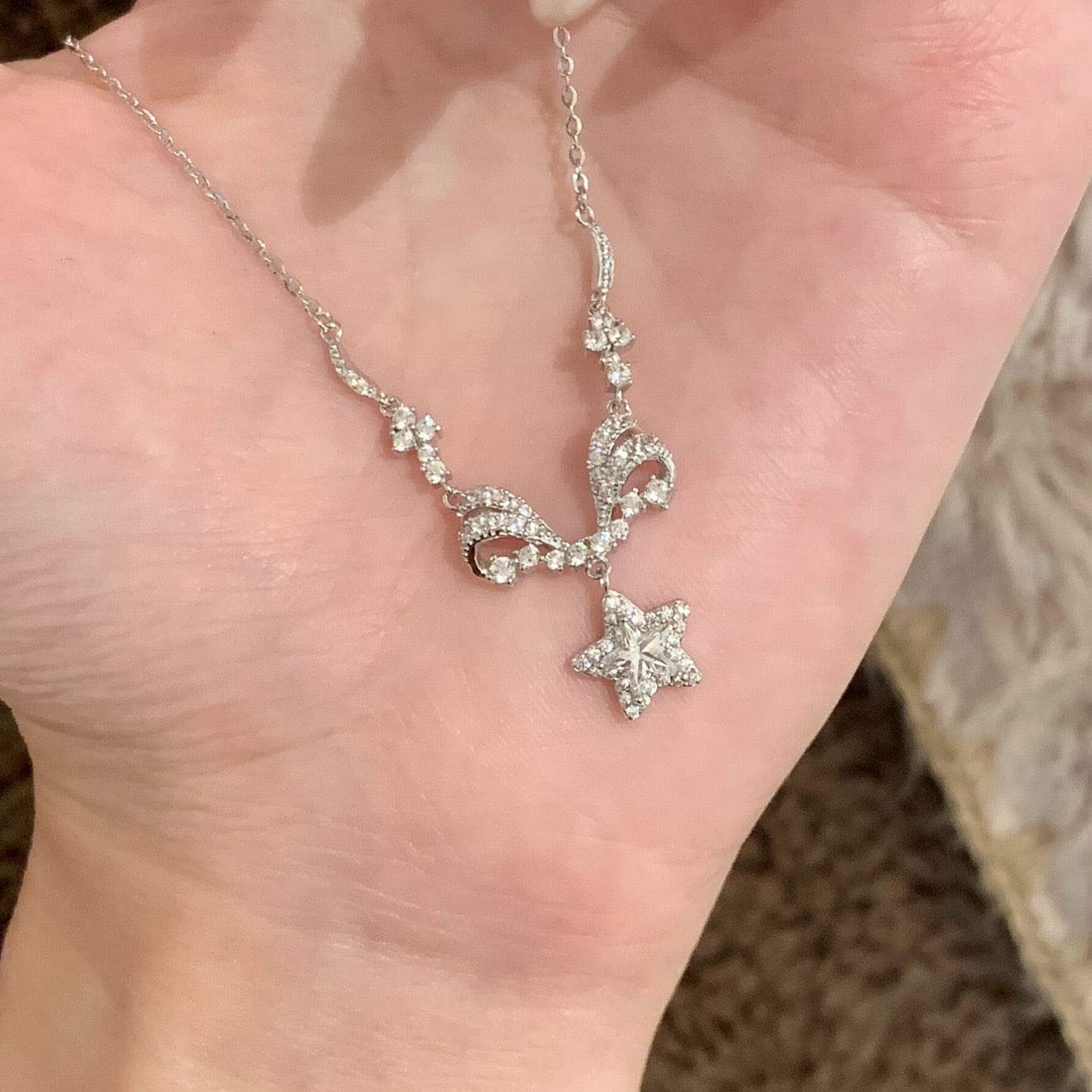 繊細な輝きを放つ星のチャームに、エレガントなリボンを添えたロマンティックなネックレスです。贅沢に敷き詰められたジルコニアが、動くたびに光を反射し、デコルテを華やかに彩ります。