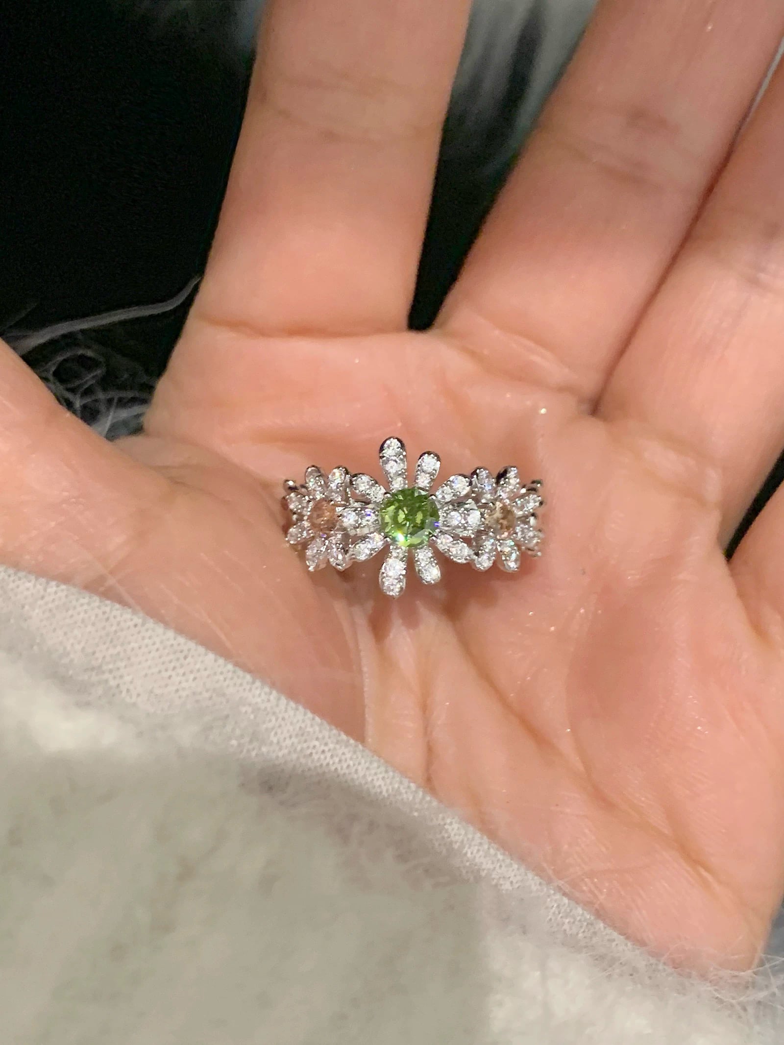 オリーブグリーンとシャンパンカラーの煌めきが調和する、心躍るようなフラワーモチーフのリングです。