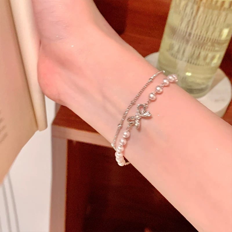 「手元に、小さな幸福を。贅沢な2連のパールリボンブレスレット」